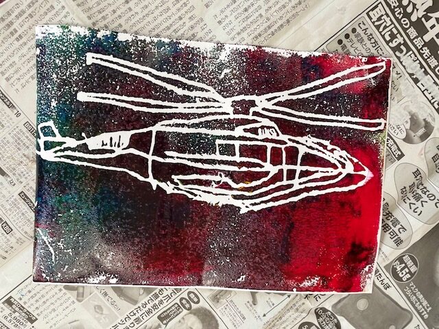 周りは青くして、ヘリコプター本体には赤をうっすらのせての版画です。真ん中の本体がきれいに浮かんで見えますね。