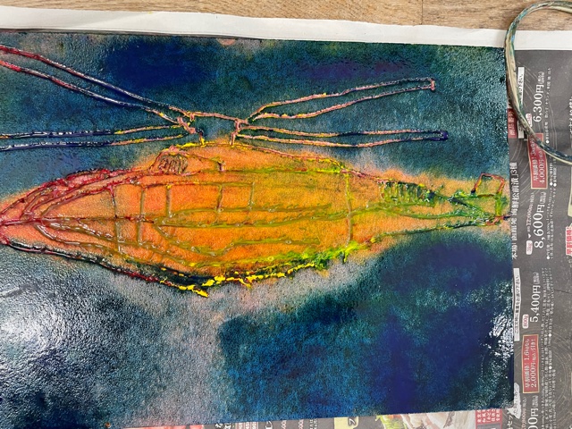 下絵を書いて、スチレンボードにまた書き、爪楊枝やボールペンで圧をかけて書くと、スチレンに絵が書けます。