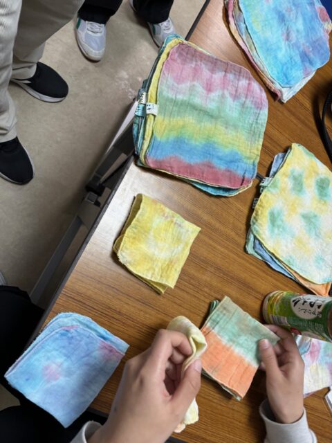 午後は、ハンカチを染めました。こちらも、靴下で使っていない色を使ったり、好きな色を再度使ったりと様々でした。