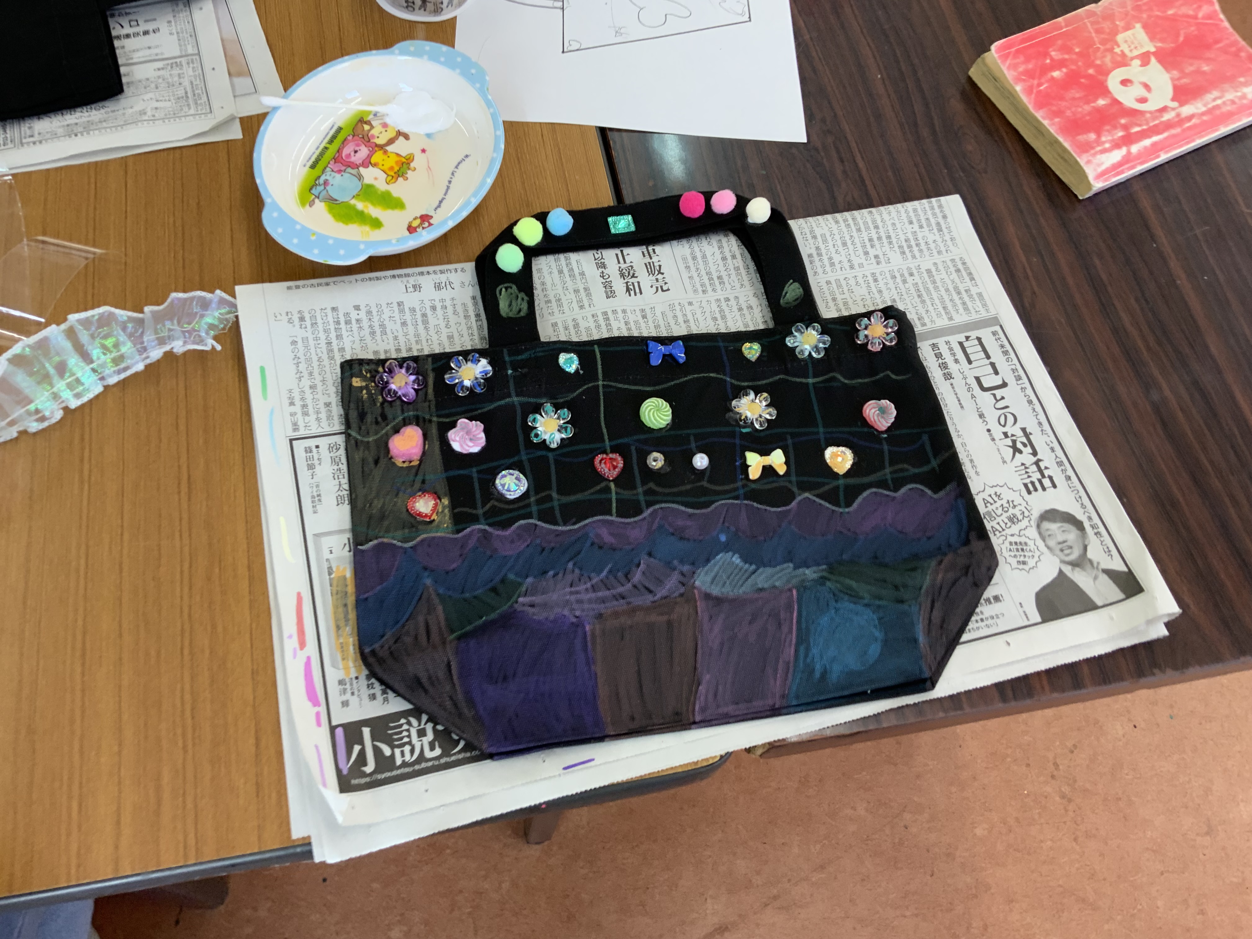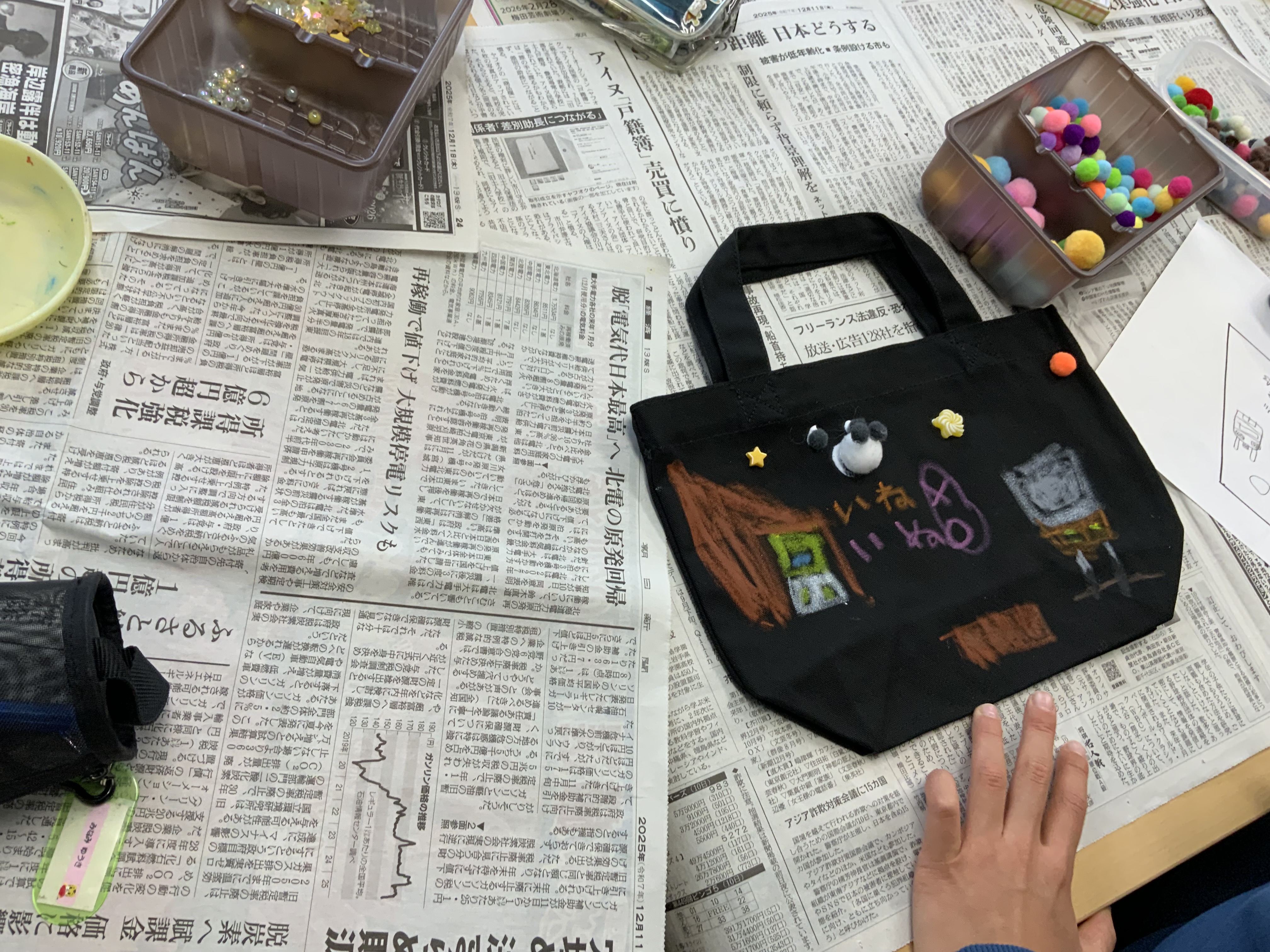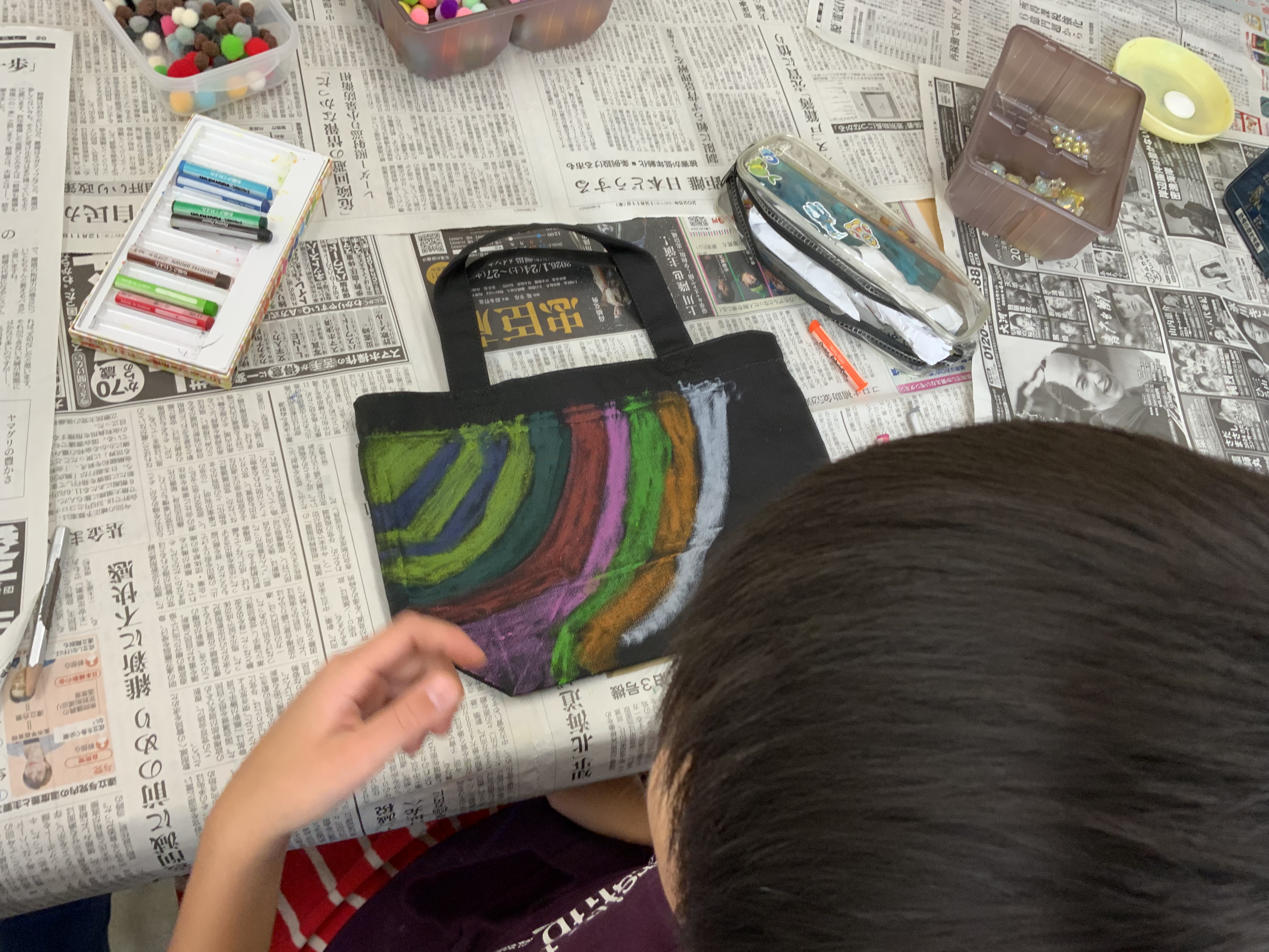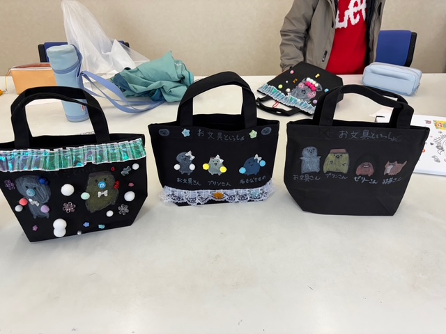 <4日目>今日は最終日。ゆったりとして時間の中で過ごしました。今日は、「トートバッグ作り」でした。真っ黒の無地のカバンに、自由に絵を描いたり、装飾したりとオリジナルなものができました。