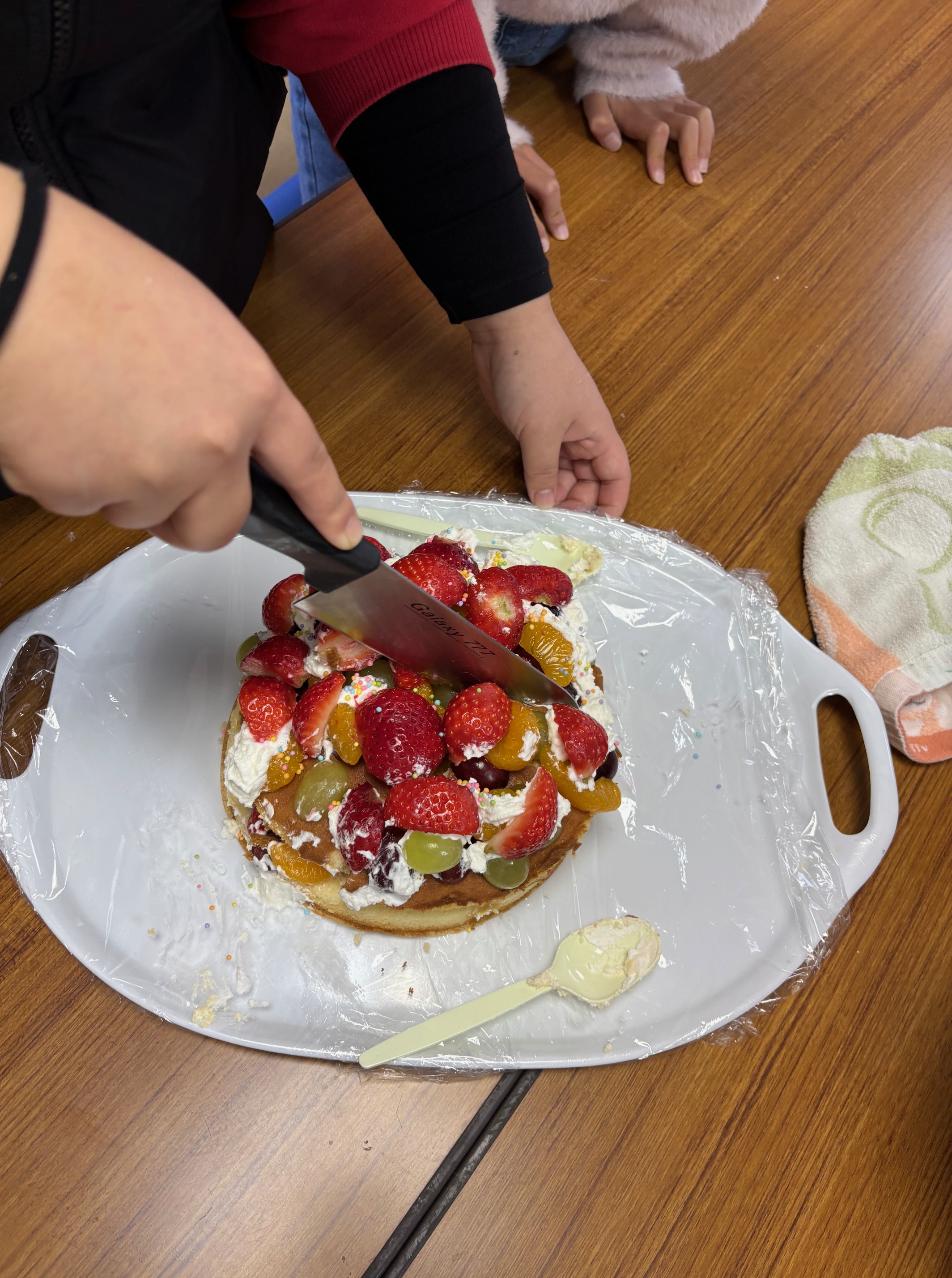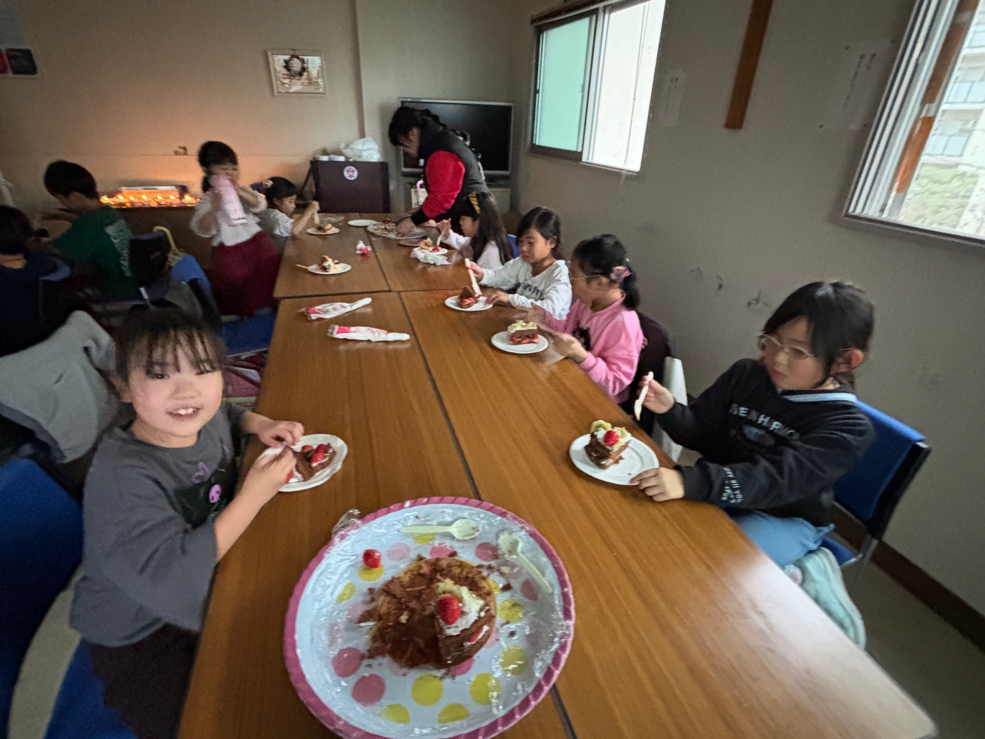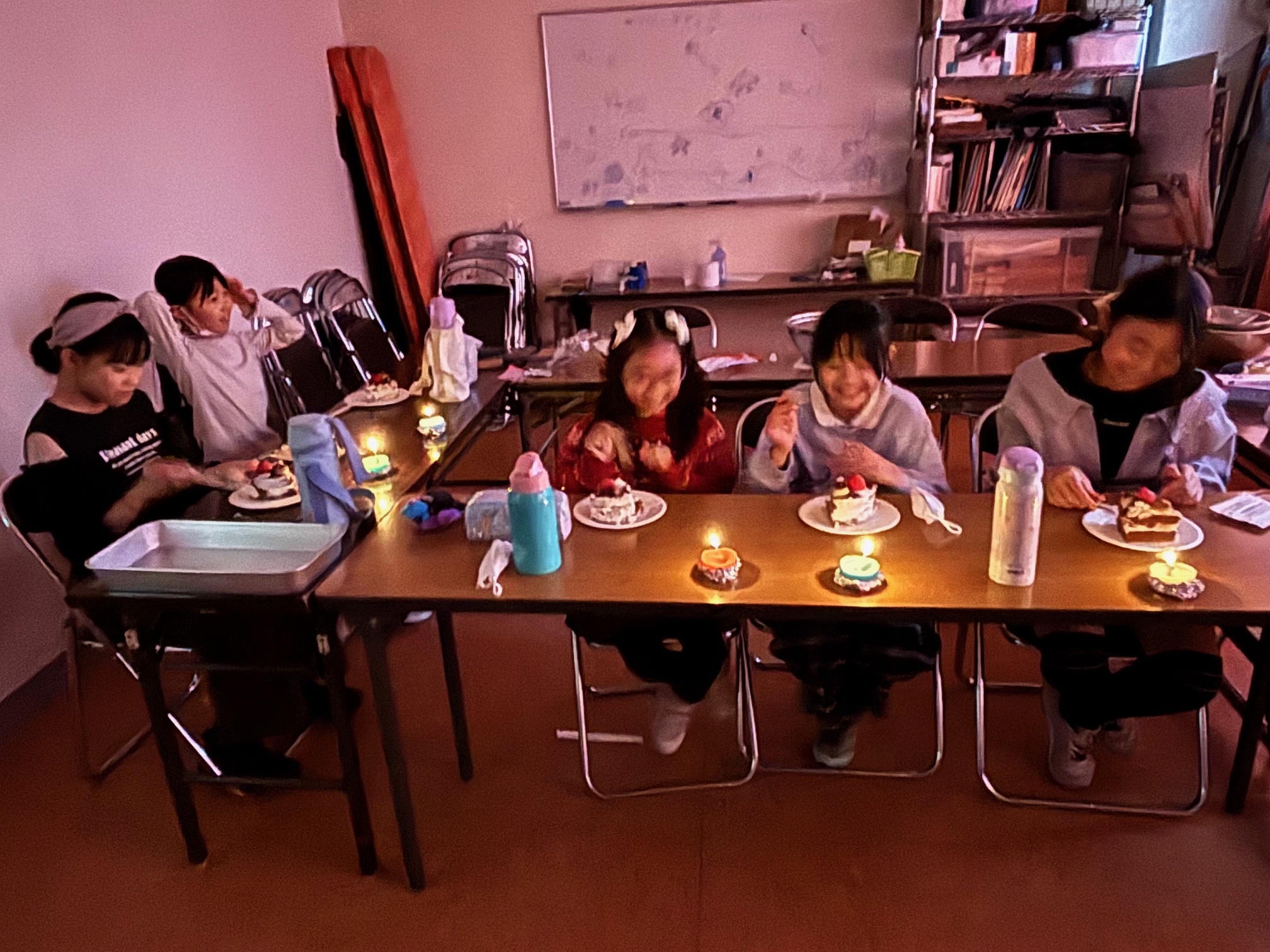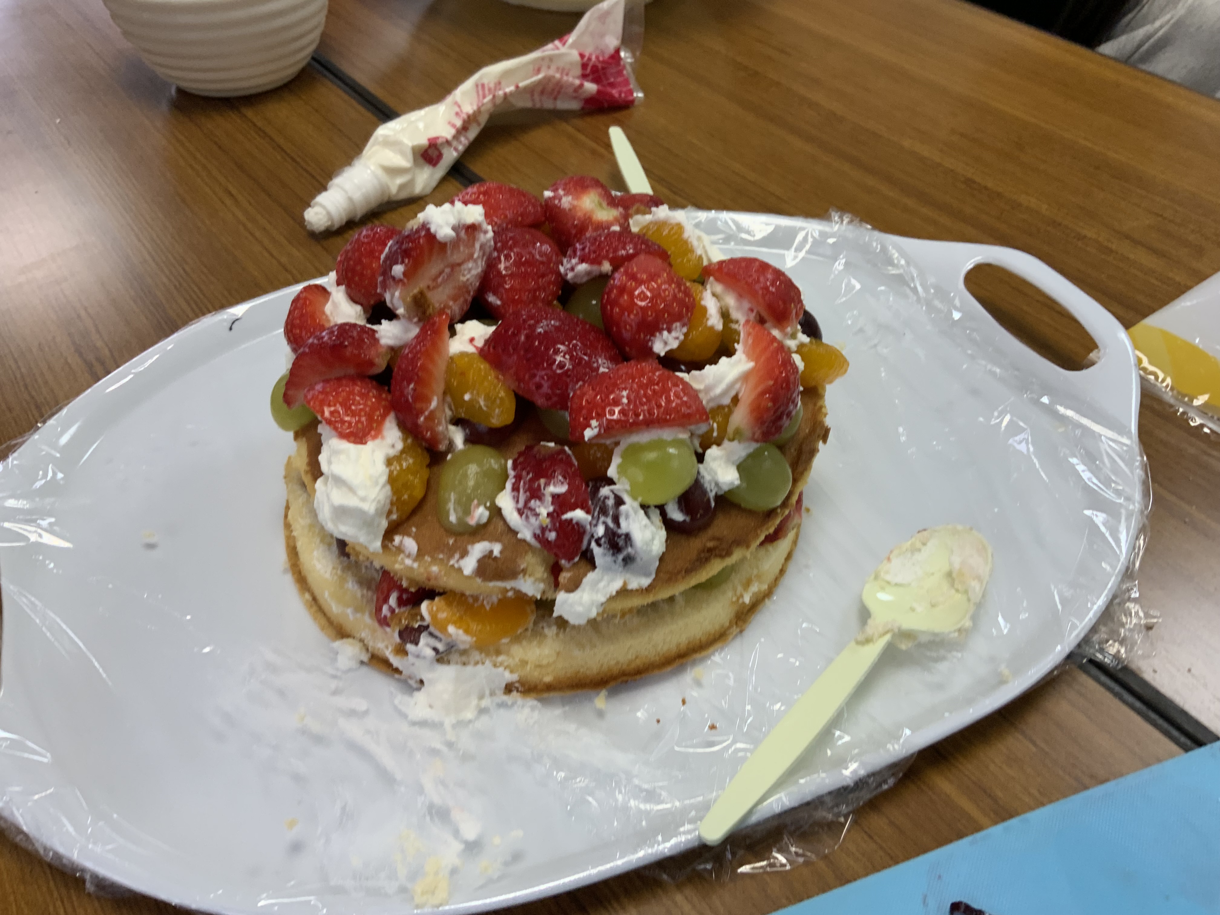 この日は、クリスマス会としてクリスマスケーキを班で作りました。スポンジにどんなフルーツをのせたいかグループで考えて決めてスーパーは買い出しに!いよいよ作成開始!できあがりは、とてもおいしそうでゴージャスなのができました。いちごやキウイ、ブドウもありました。みんなで、食べる前に、クリスマスの絵本を読んで、クリスマスの意味を知りました。ケーキを食べる時に、作ったキャンドルに火をともして食べました。なんだか、落ち着いていつもと違う雰囲気で、綺麗で良かったです。