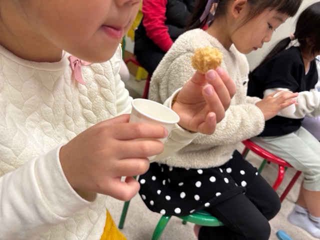 金平糖作りは、色を上からかけてそれを混ぜる作業を一人ずつ体験させてもらいました。みんな興味深々で、スタッフさんの話も真剣に聞き、取り組んでいました。試食は、カルメラ焼や金平糖を試食しました。カルメラ焼きなんて、みんな知らないよね。と言われながら、子ども達はみんな嫌がらずに食べて、「おいしい!」と絶賛でした。ほかには、ブルーベリー味・珈琲味・和三盆味・黒砂糖味を何種類かの味の金平糖を試食させていただき、これもまた「おいしい!」の連呼でした。