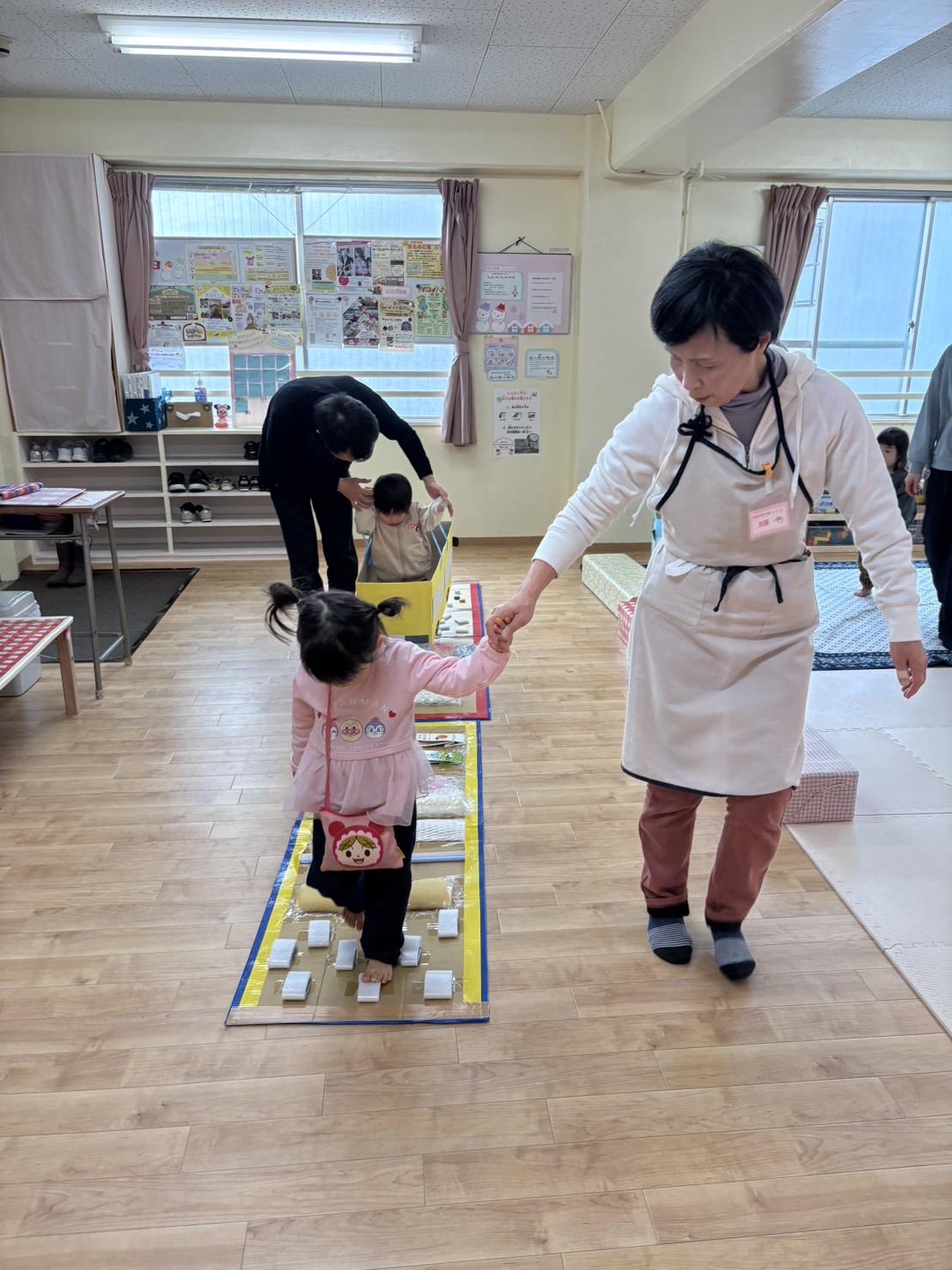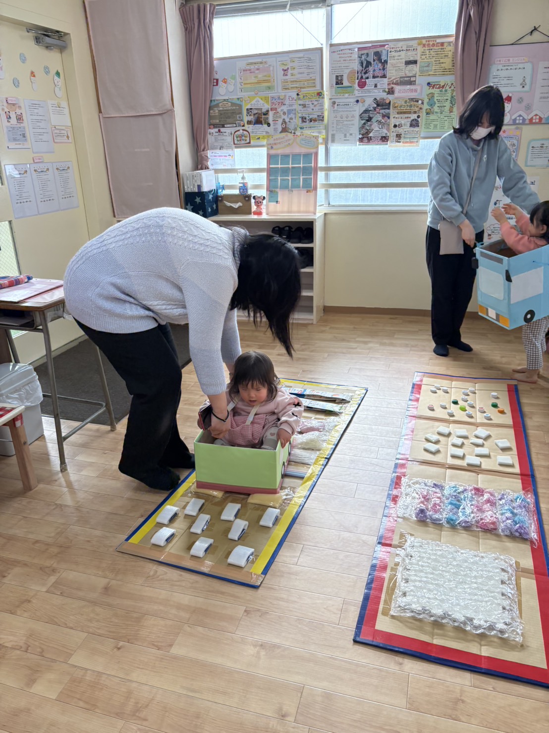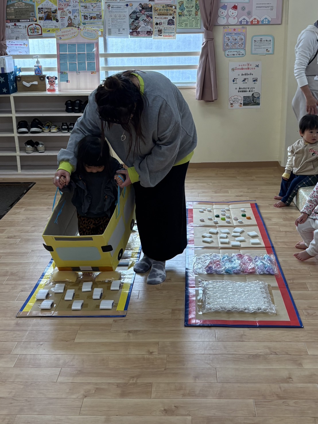 その後スタッフ手作りのバスに乗り、レッツゴー!!「バスにのって」の曲がかかると口ずさんだり、いろいろなバスに何度も乗ったりと親子で楽しまれていました。