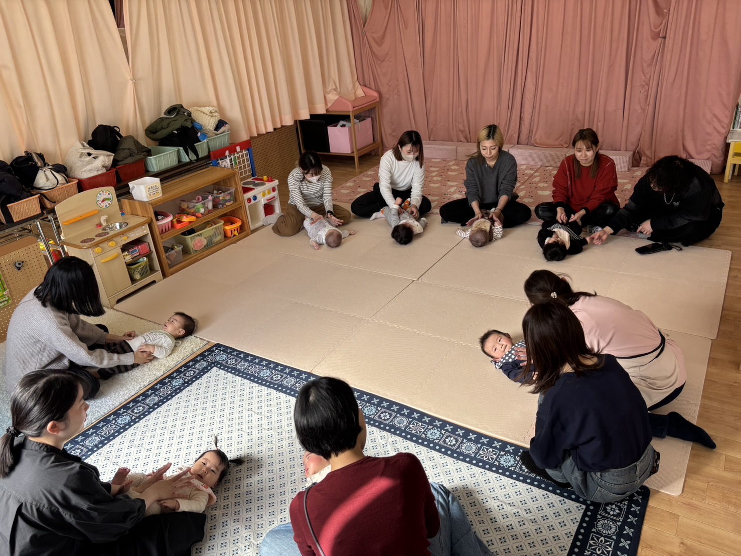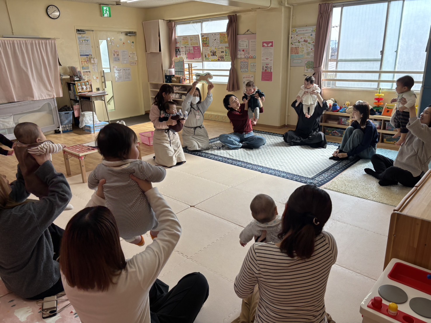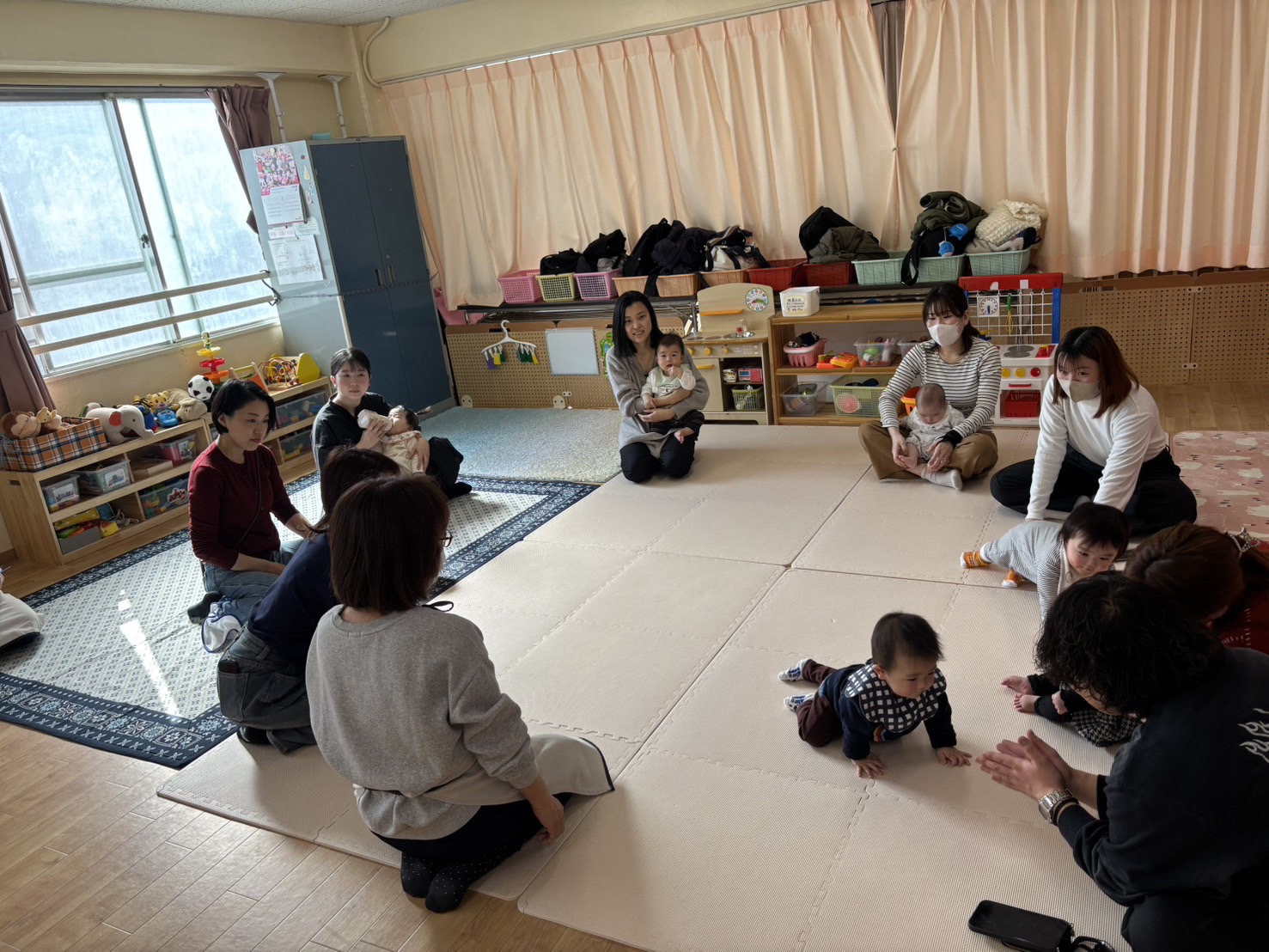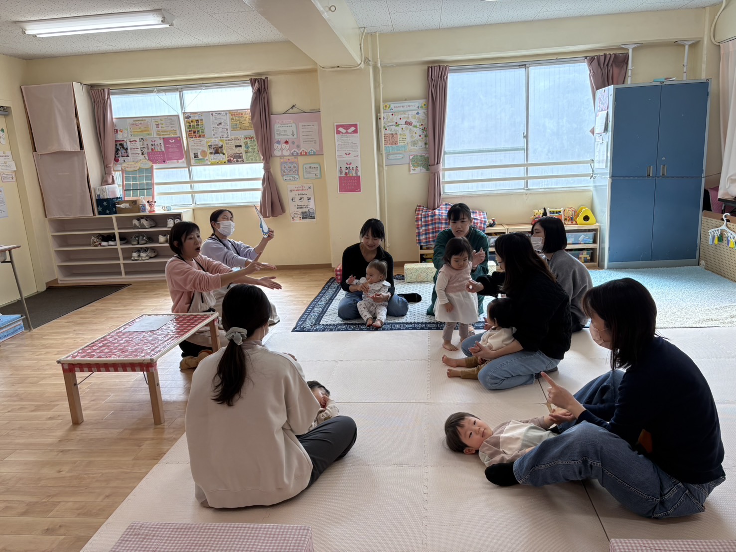 わらべ歌や触れ合い遊びを歌に合わせて体を動かしたり、大型絵本を見たりとゆったりと時間を過ごされていました。その後自己紹介やお子様のエピソードなど話をしたり、子育てについて雑談をしたりと同じ月齢のお子様同士で交流が出来たことがとても楽しかったとのお声をたくさん頂きました。