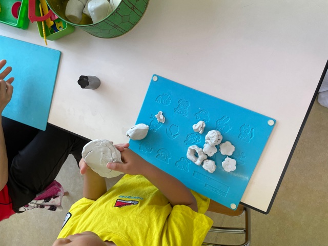 小麦粉粘土は、さらさらの真っ白の小麦粉に色粉をまず混ぜて色をつけ水を入れてこねこねしました。始めは、べちょべちょでこの感触を嫌がっていましたが、やめないでそのままこね続けると手にもつかない粘土になってくるのでその変化も楽しみました。粘土になったら、すきな物を作り、上手に恐竜をつくるお友だちもいました。
