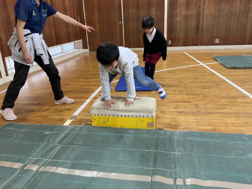1月は「跳び箱」月間だったので跳び箱が上手にできるように、手押し車など頑張ったね。