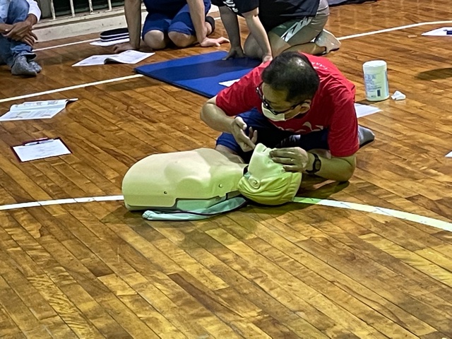 ダミーを使って、心マッサージ(胸骨圧迫)と、AEDの使い方を実践しました。