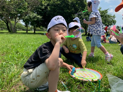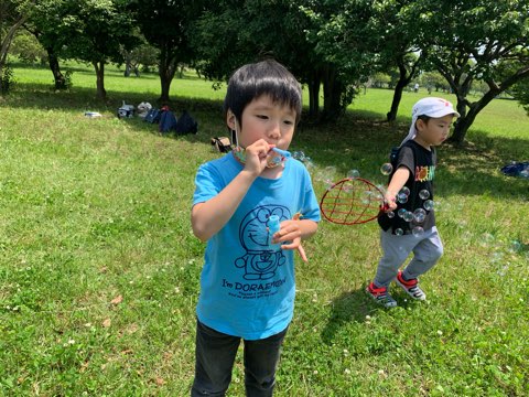 小さいシャボン玉にも、大きいシャボン玉にもみんな大はしゃぎ!!
