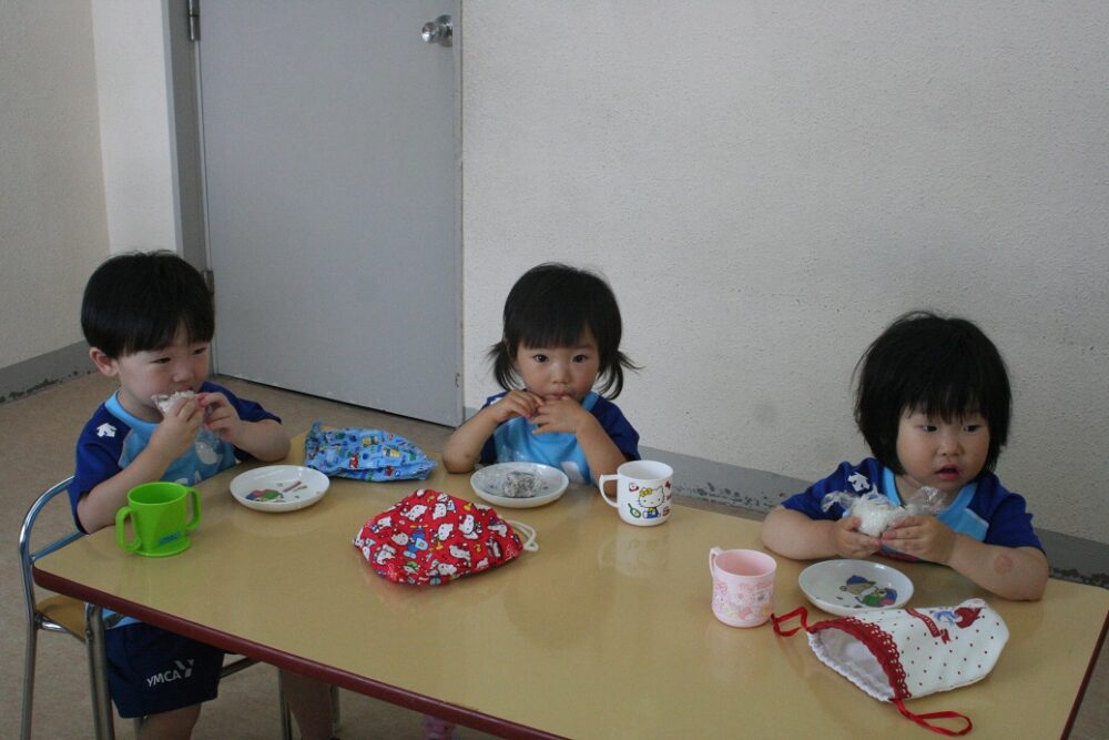 お部屋に戻って、今日は「おにぎり日」でした。お家から持ってきたおにぎりを、みんなとっても嬉しそうに食べていました。お友だちと見せ合いっこをしたり、いつも以上に会話が弾んだように思いました。