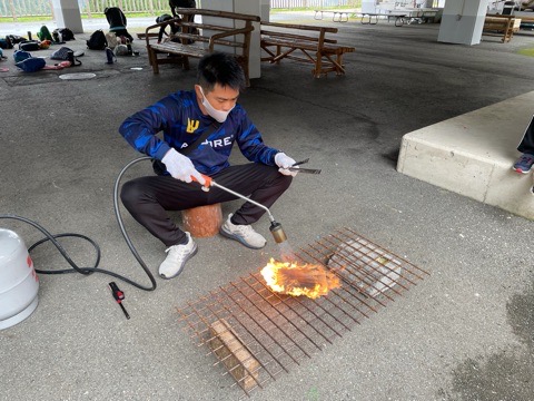 その後はリーダー達に板を焼いてもらって、タワシや新聞紙を使って板をピカピカに磨きました!