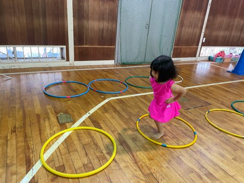 フープをグーグーパーしたり、ケンケンパーをしたり!
