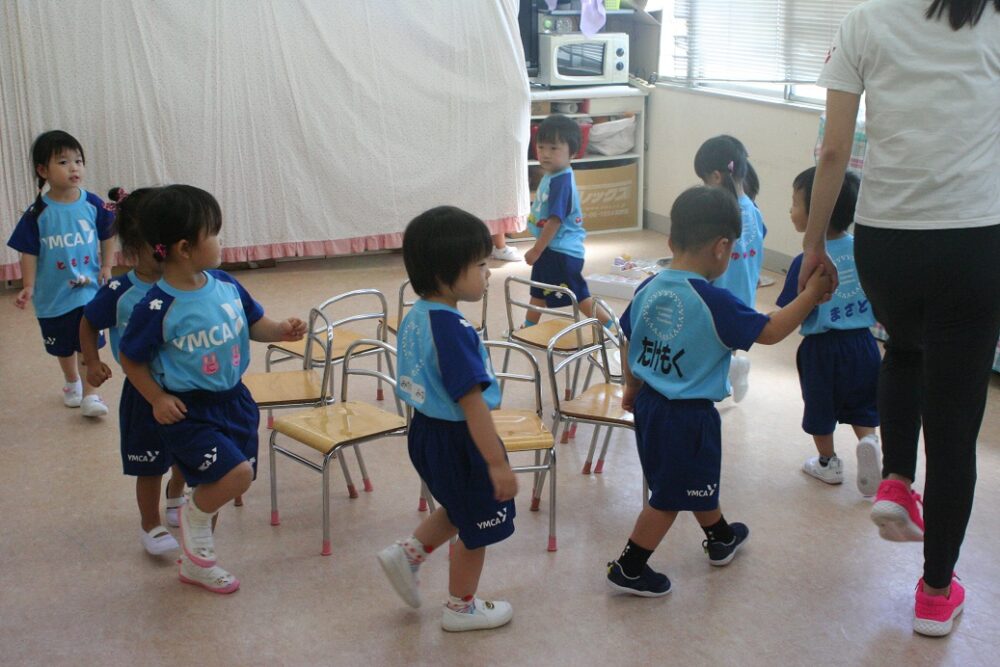お部屋では椅子取りゲームをしました。1学期に比べて椅子にすぐ座るというルールをしっかり理解しながらできました。