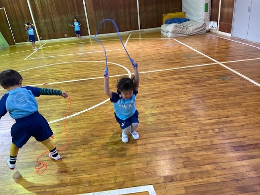 今日が2学期最後の体操でした。器具はしないで、なわとびや大繩や、リレー、2チーム対抗ゲームをして遊びました。