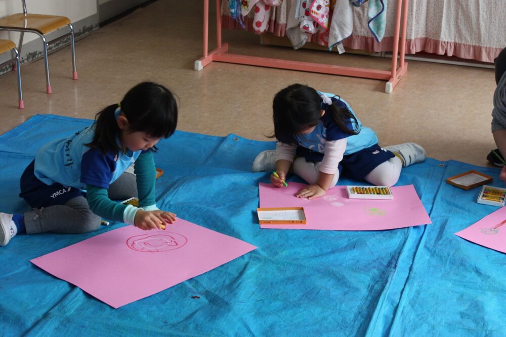 お部屋では、クレパスで自由がを描きました。一人一人頭の中にテーマがあって、その世界観に沿って描いていくようになりました。最初は家族などの絵を描いていることが多かったですが、絵の描き方にも成長を感じます。『〇〇が~しているところを描いてるねん!」など、説明も具体的になりました。また、春のころの絵と比べてみてくださいね!