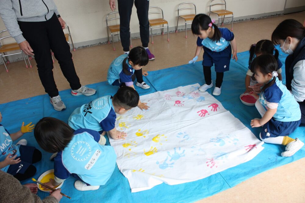 お部屋では、おもちゃ棚の幕にハンドペイントをしてもらいました。全員分のかわいい手形がつきました(お休みのお友だちも次にぺったんしてね!)