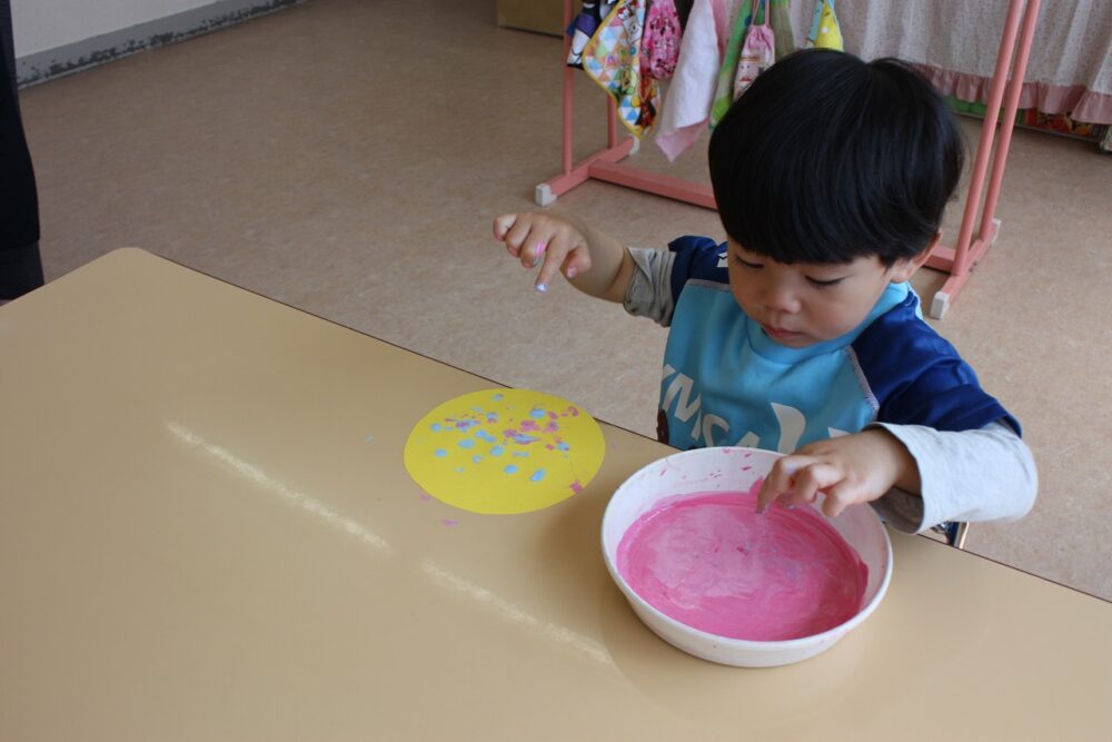 お部屋では絵の具を使って、指でスタンピングをしました。