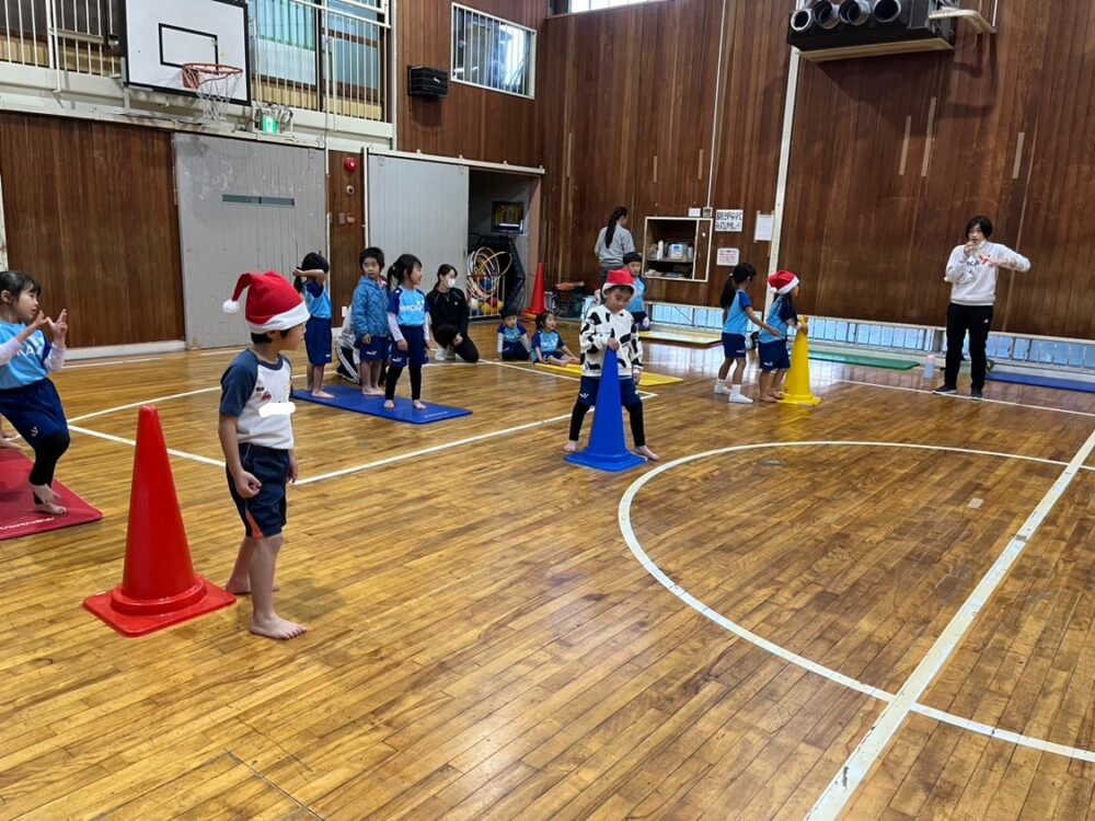 今日は体操のあと3グループに分かれてリレーをしました!クリスマスが近いので、サンタの帽子をバトンにして対決しました!