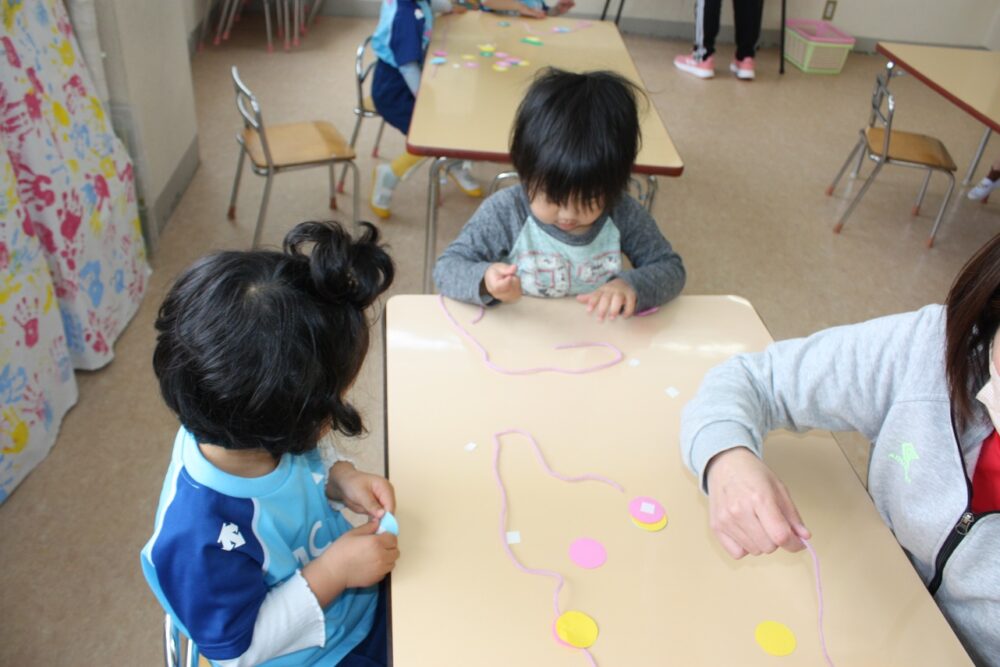 お部屋ではネックレスを作りました。紐を挟んでつけるのがなかなか難しい!でも、リーダーに助けてもらいながら上手に頑張っていました!