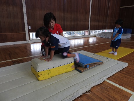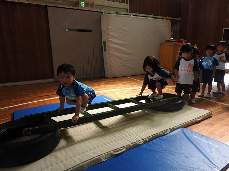壁から壁ははやく走りました。頑張ったお友だちは、前でリーダーに頑張ったご褒美のたかいたかいをしてもらえます。みんなとてもはりきって走っていました。