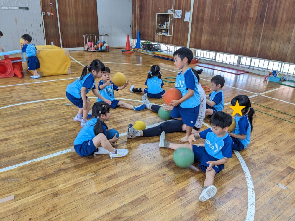 ボールは、座ってバランスをとったり足のまわりを転がしたりしました!