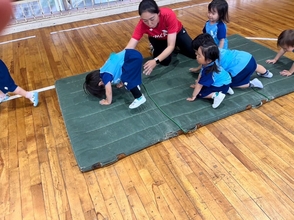 ちょっと、新しいことにもチャレンジ!カエルさんになって手をついたままお尻をぴょこんとあげる動きをします。初めてなのにとっても上手!跳び箱のための基本練習のひとつです。