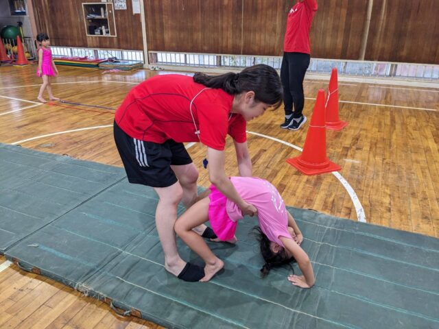 マットでは、基礎をした後、キリン歩きでロープの橋を渡ってコーンの間をくぐったり飛び越えたりしました。キリン歩きは橋から落ちないように上手にバランスをとりながら頑張れましたね♪最後にブリッチの練習もしました。みんな怖がることなくチャレンジできましたね^_^