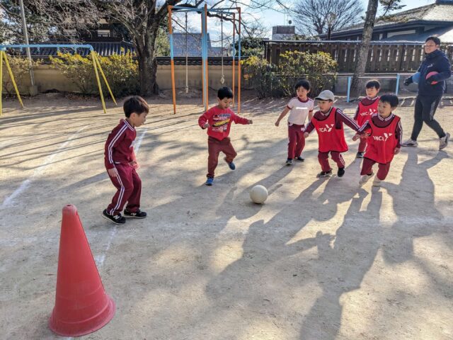 そのあとサッカーをしました。初めて試合をしたお友だちもいてたと思いますが、一生懸命ボールを追いかけて、ゴールをすることもできましたね!