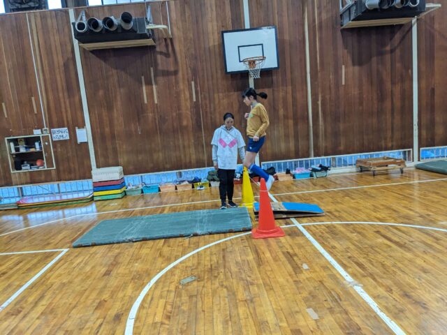 跳び箱では、サーキットで行ったロイター板ジャンプや跳び箱を手で押す練習などを活かして跳べるようにしていきましょう!