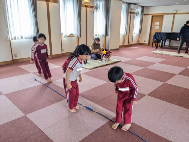 最後にホールでサーキットをしました。前転では、しっかり頭を入れて体を丸くして回ることができましたね!
