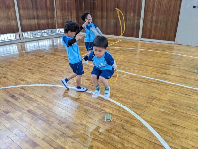 年長さんは、引っかからずに連続で跳べるようになりました!年少さん、年中さんもしっかり足を揃えて跳ぶことができました!難しくても諦めずに練習し続けることができましたね!