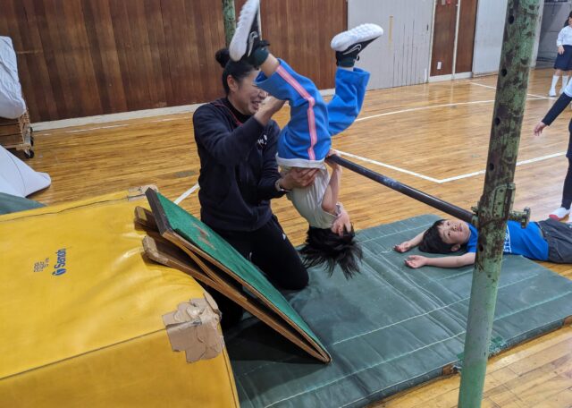 トランポリンでは、グーパーの連続などをしました。昨日より体をうまくコントロールできるようになってきましたね!