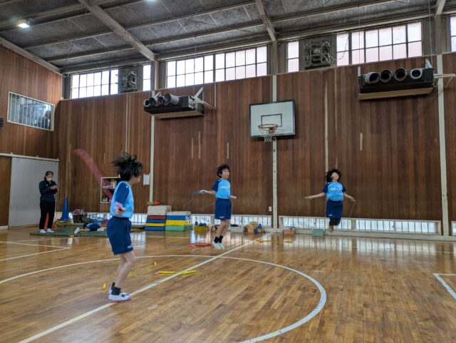 はじめに走ったりスキップをしたあと、2人組になって足をジャンプしたりくぐったりしました。