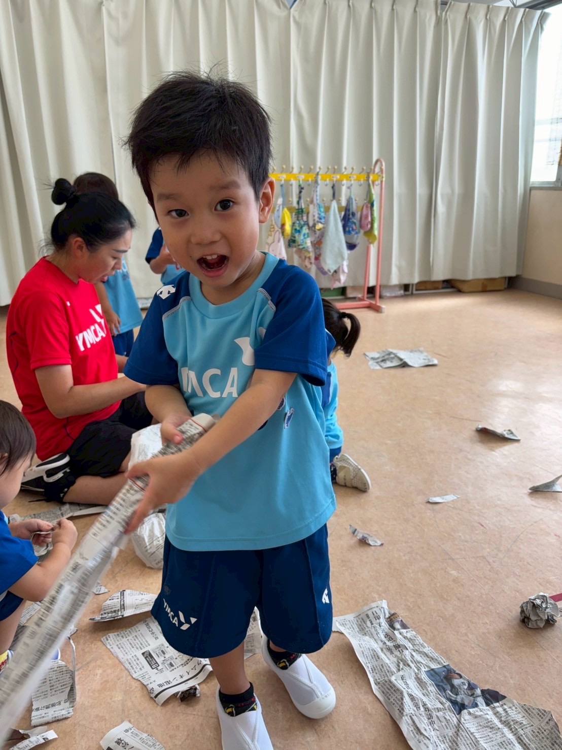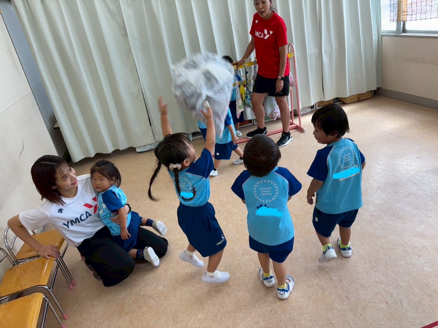 お掃除し終えた袋を丸めて大きなボールを作りました。思ったより重みもあったのですが、ボーンと高く飛ばしていました。おもしろかったね!