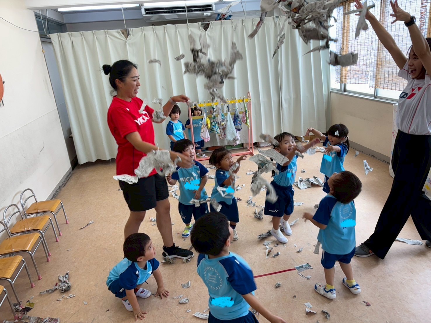 お部屋では新聞遊びをしました。皆でびりびり破って雪を降らせました。1,2の3の合図で一斉に降らせると、みんな大歓声!