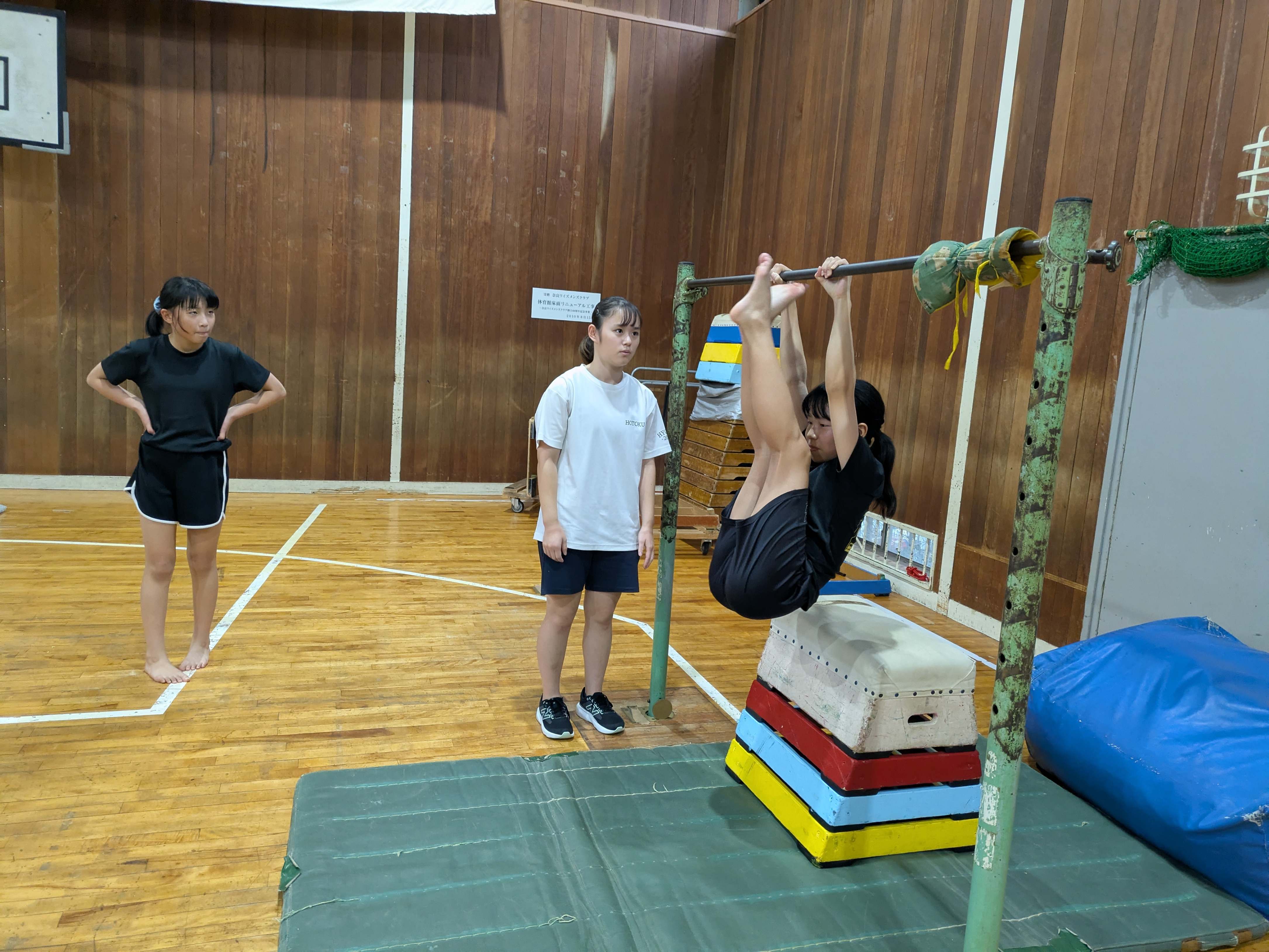 トレーニングでは、鉄棒で足上げ腹筋をしたり倒立パタンをしたりしました。