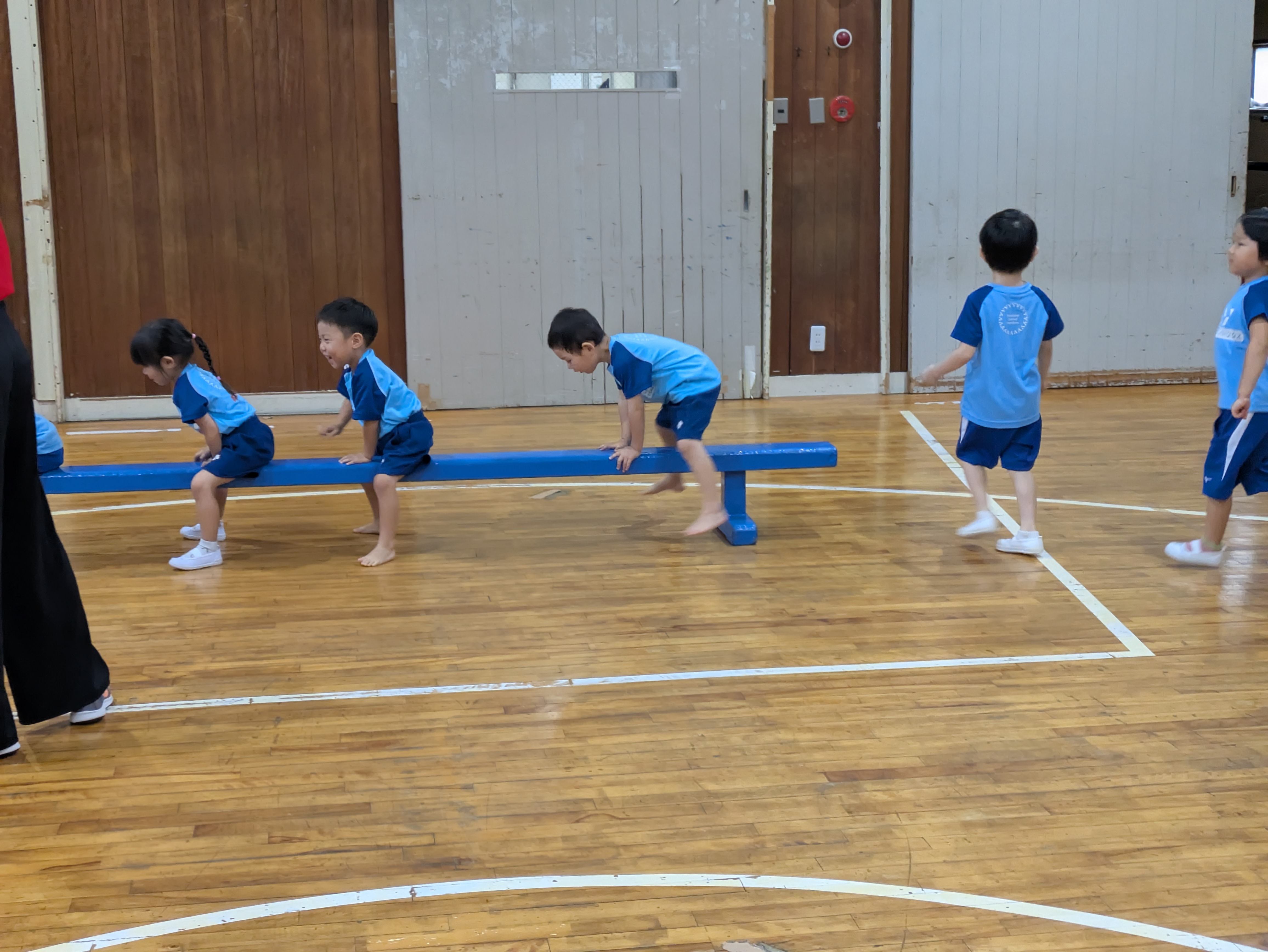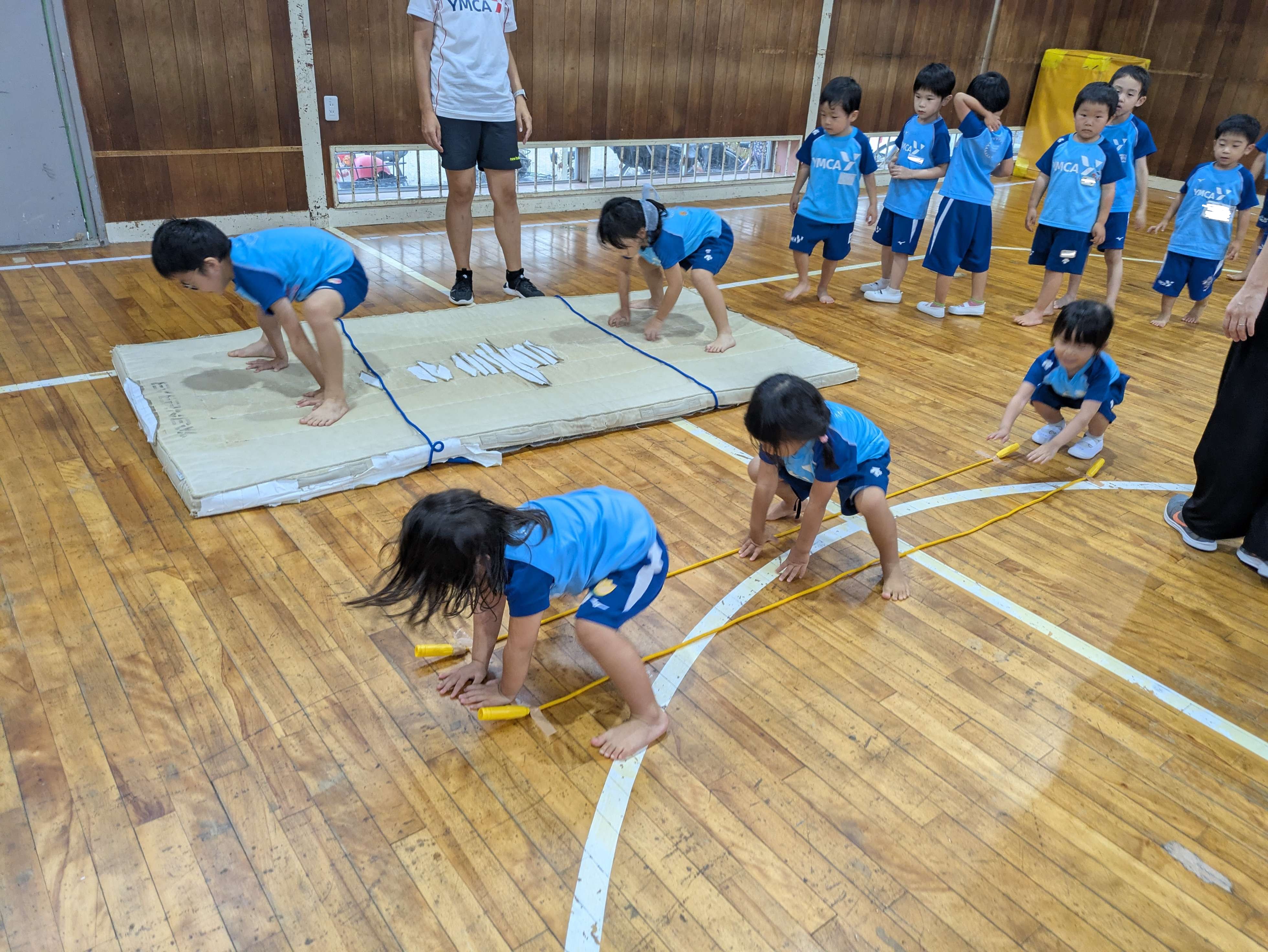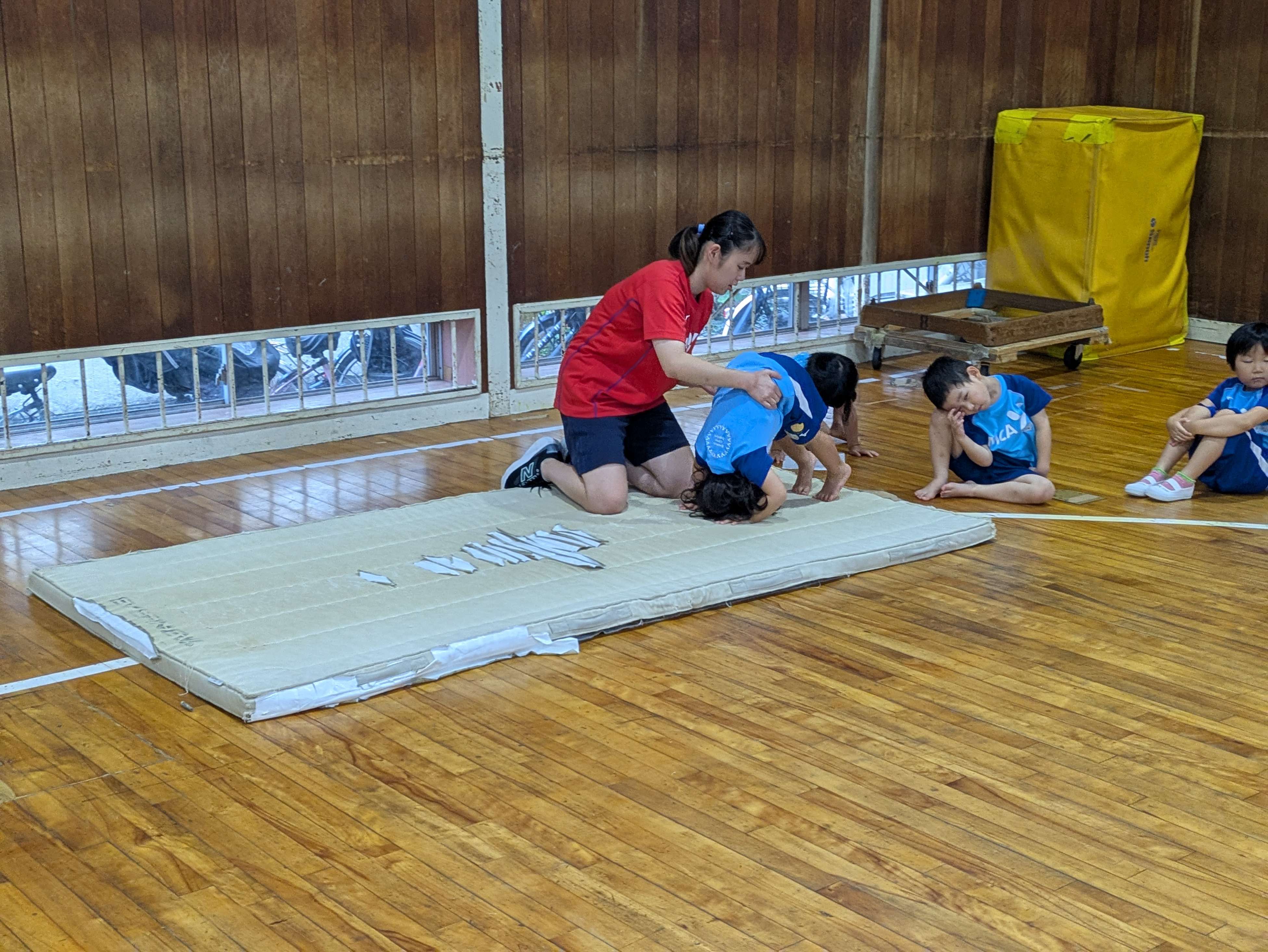 マットの前転や後転では、体が途中で開いてしまわないように、しっかり丸まったまま回れるように頑張りましょう!