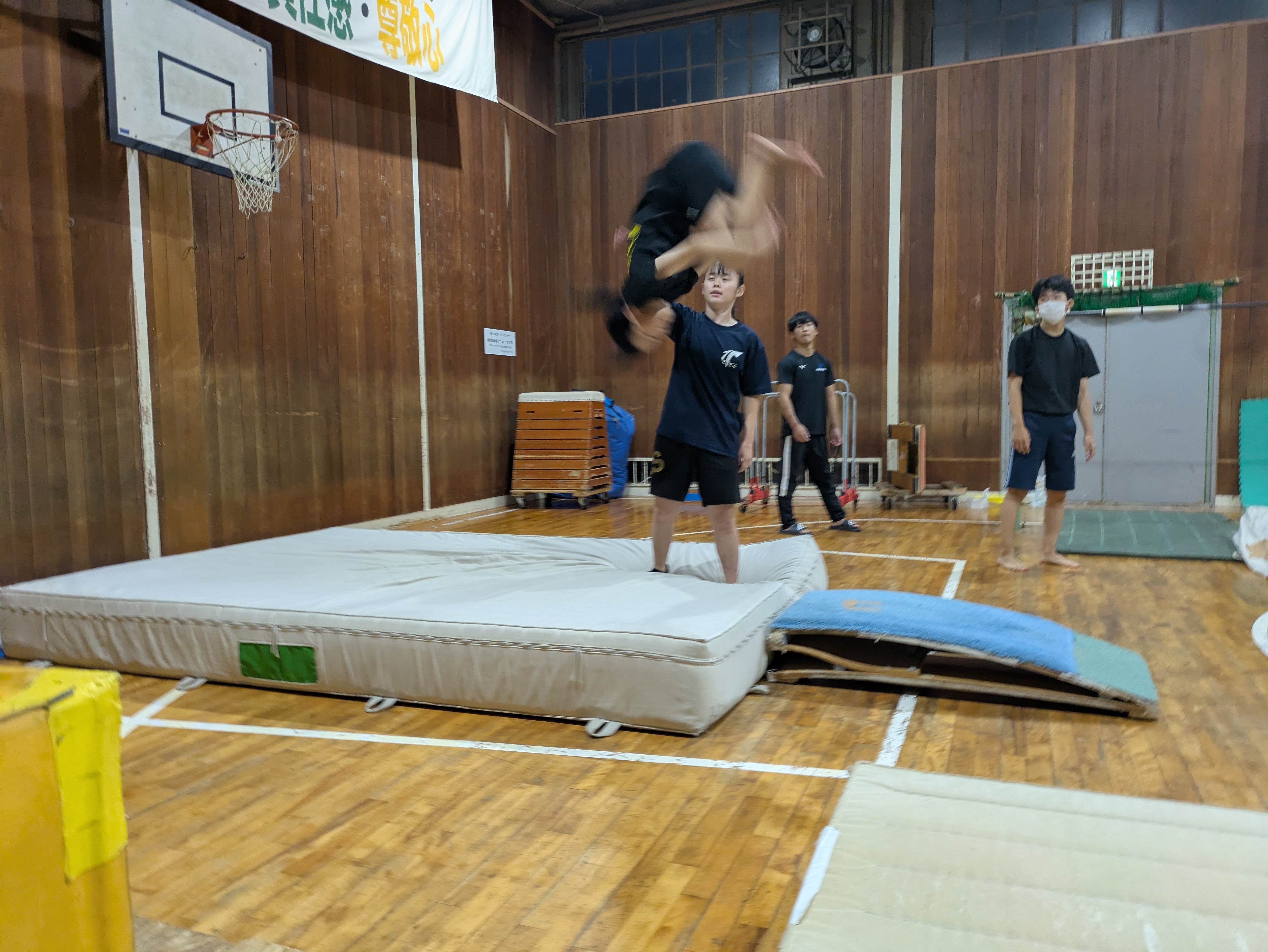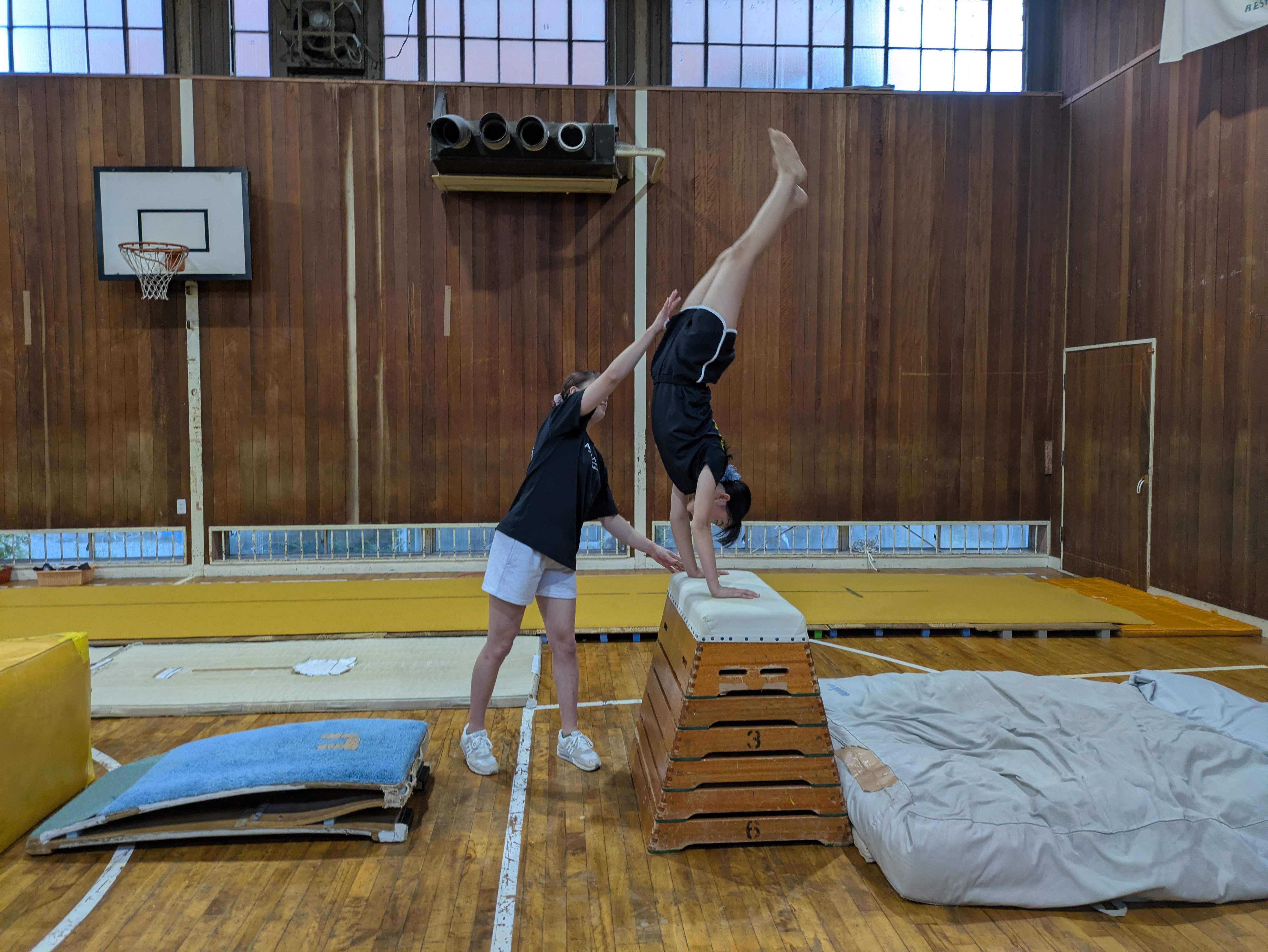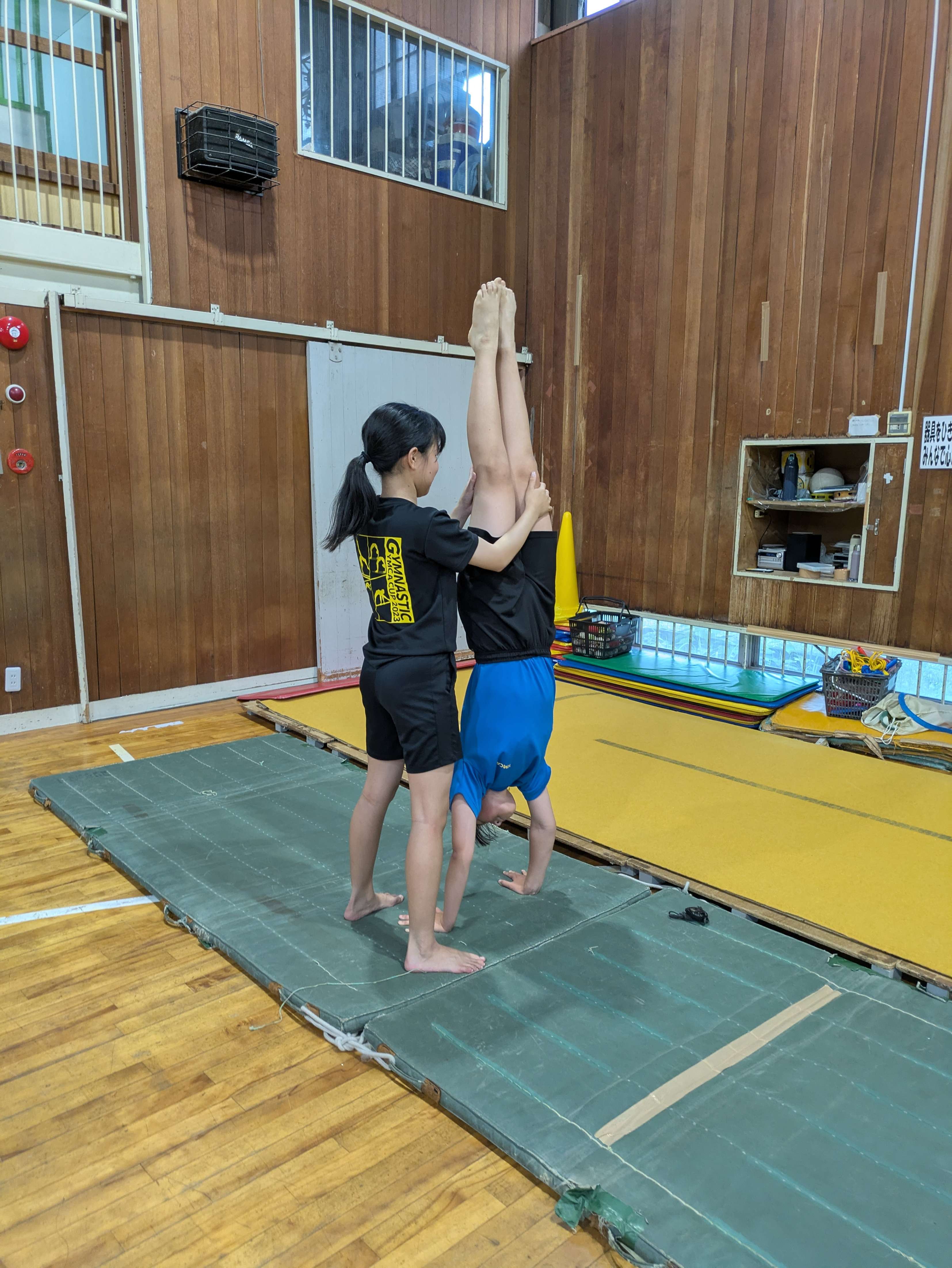 トレーニングでは、なわとびや鉄棒で足上げ腹筋などをしました。振り上げ倒立では、体を真っ直ぐにしたまま跳び箱に手をつけるよう、しっかり足を振り上げられるようにしましょう!