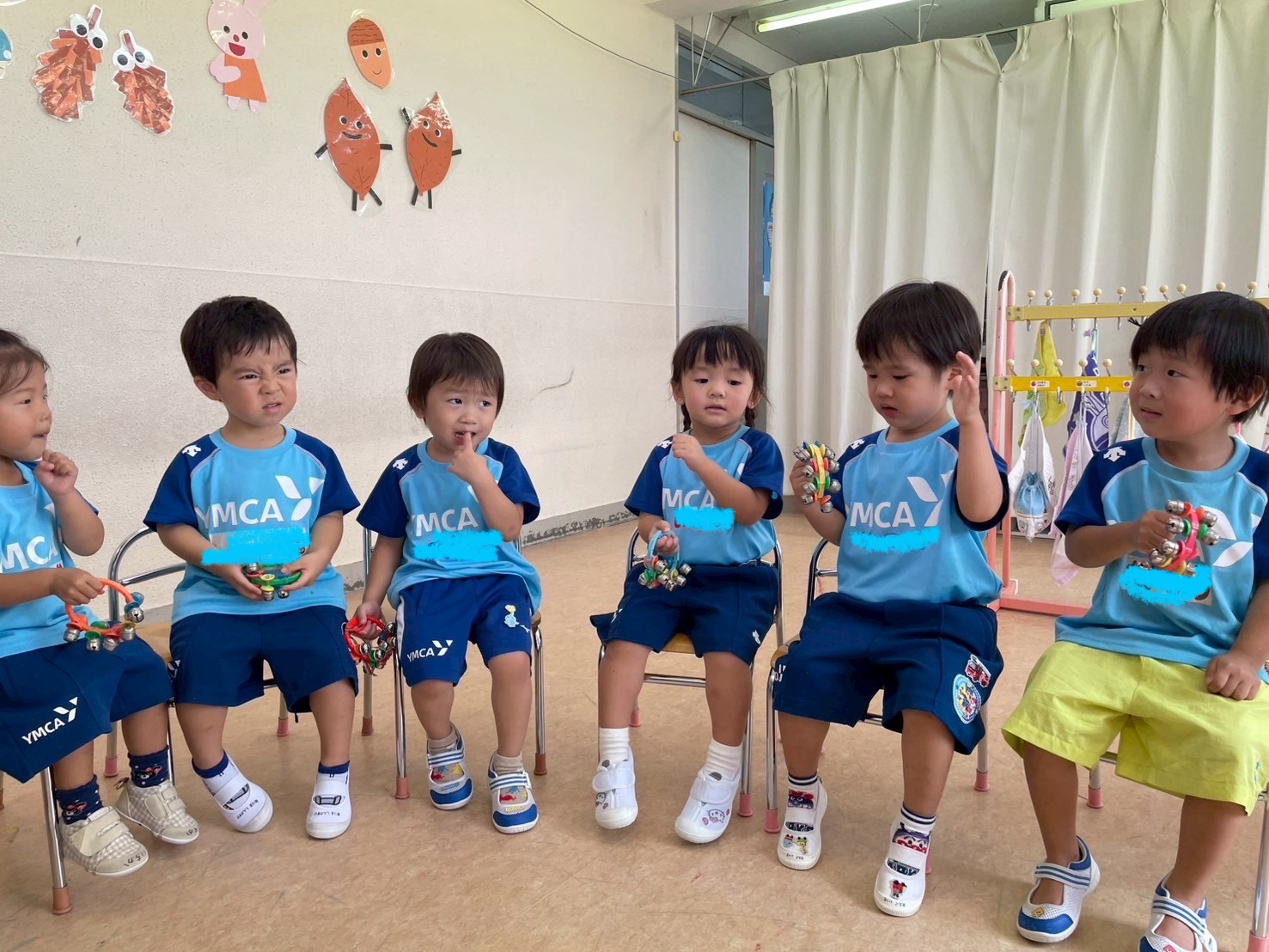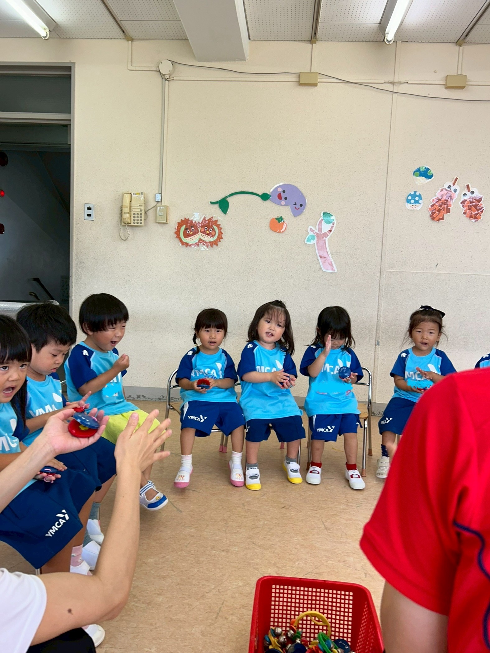 お部屋では楽器遊びをしました。歌を歌うことが大好きな子どもたち。リクエストもたくさん言ってくれています。今日は、鈴とカスタネットを皆で一緒にしました。リズム遊びもじょうずにできました。