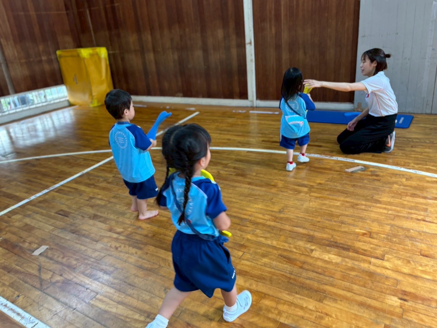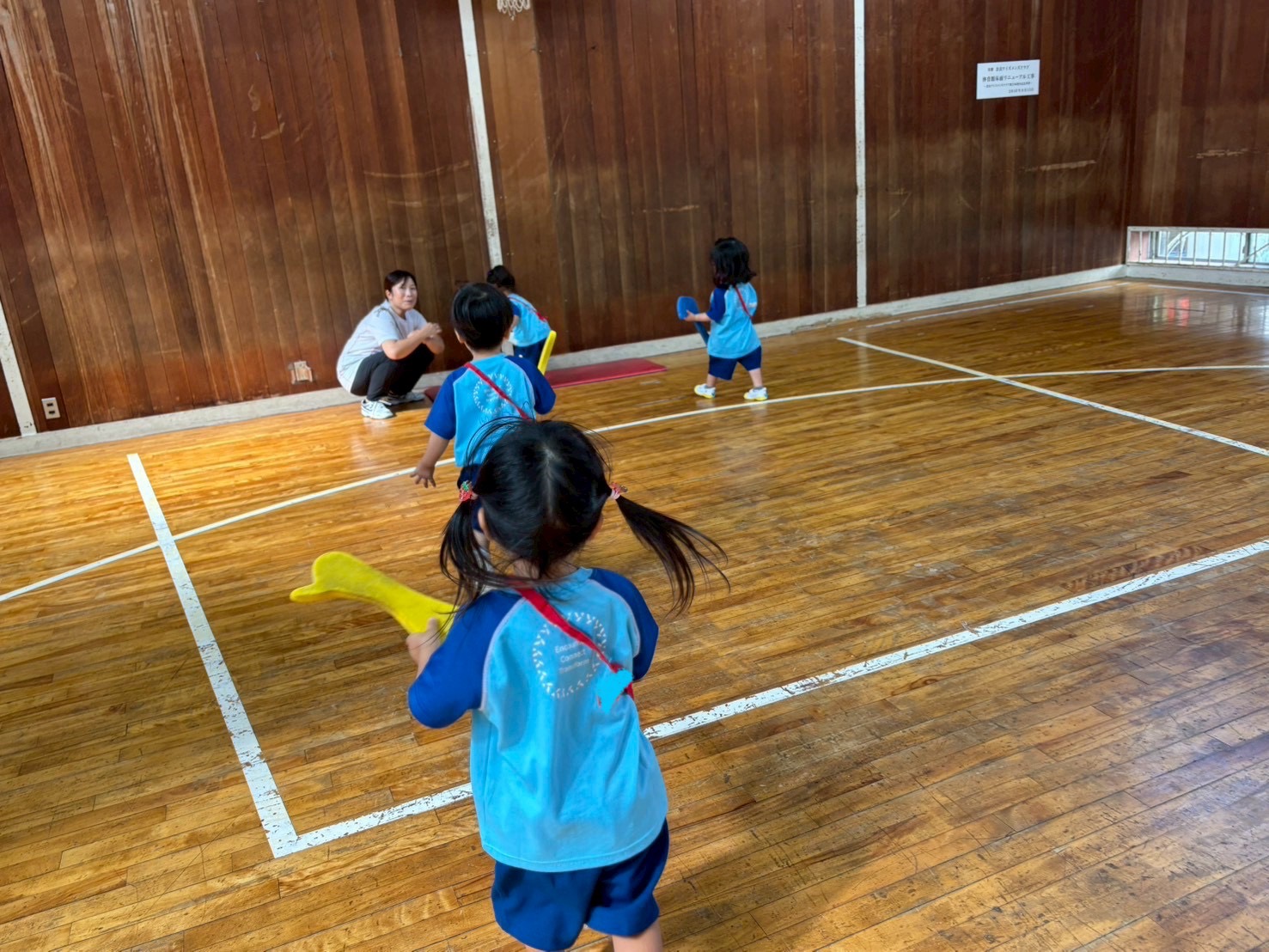 今日は「アヒル取りゲーム」をしました。青チームと赤チームに分かれて行いました。笛の合図に合わせてスタート!いそげいそげ~!