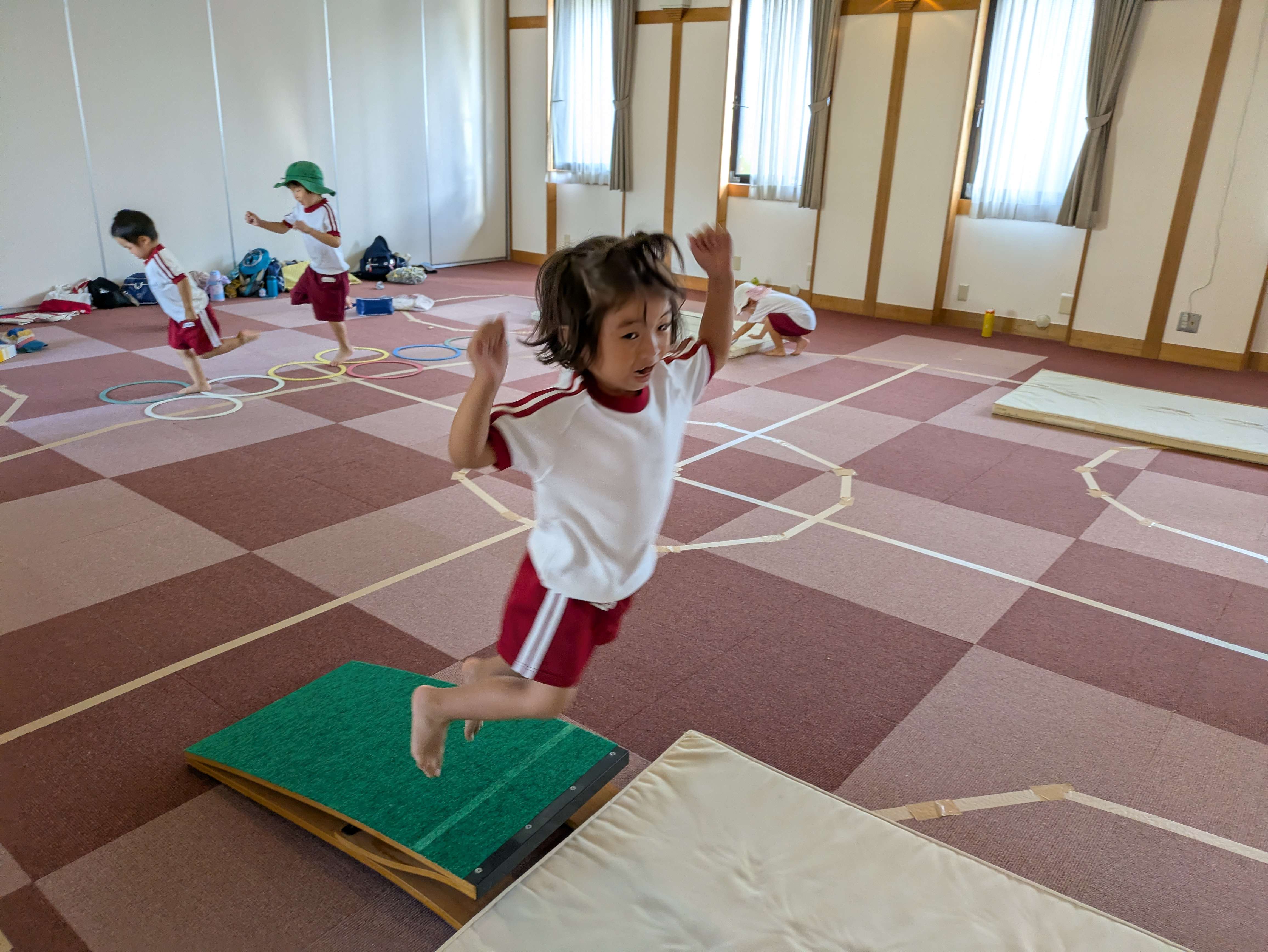 サーキットでは、前転やロイター板でのジャンプの確認などをしました。ロイタージャンプでは、しっかり足を揃えて跳ぶことができていましたね!