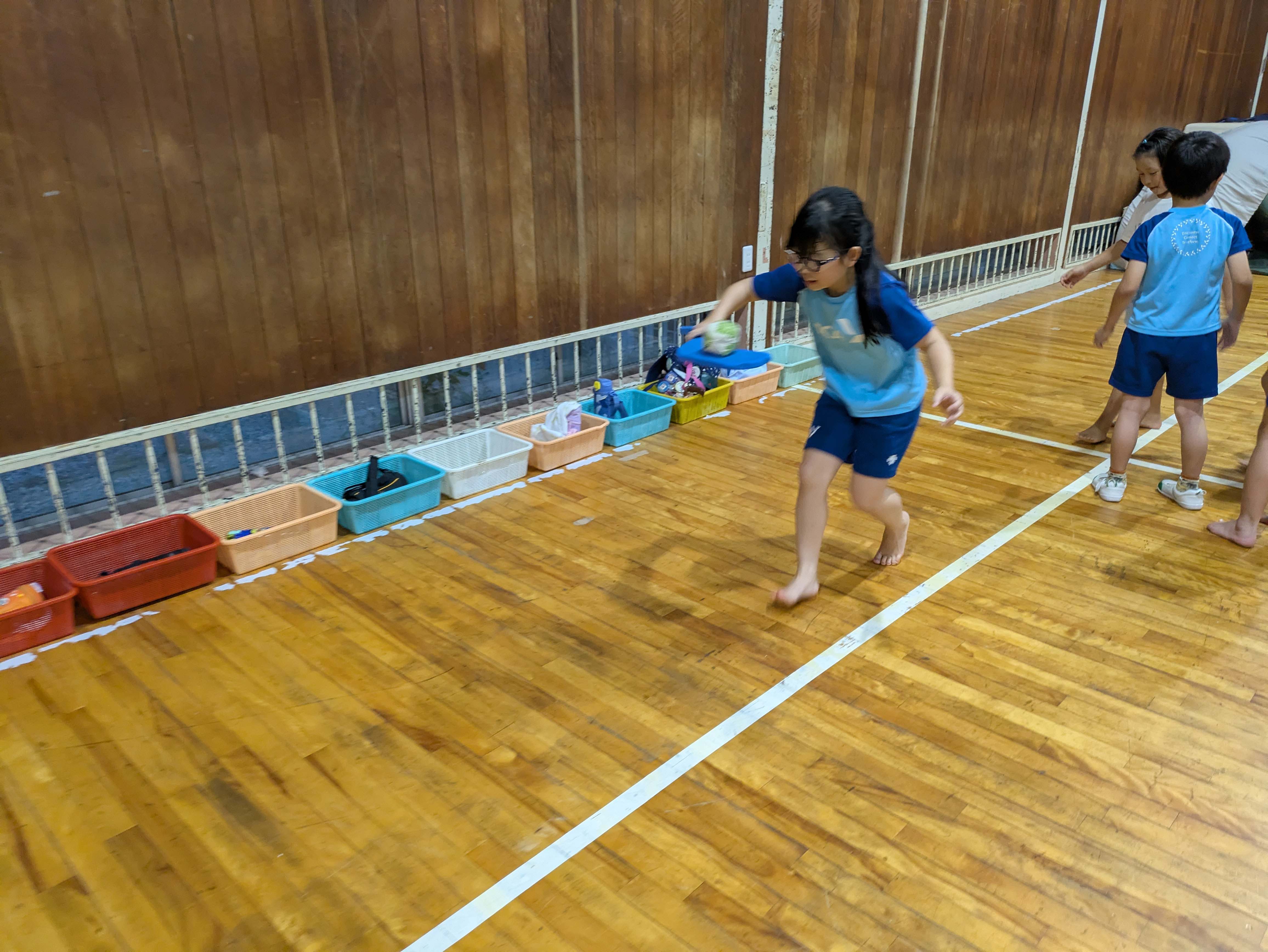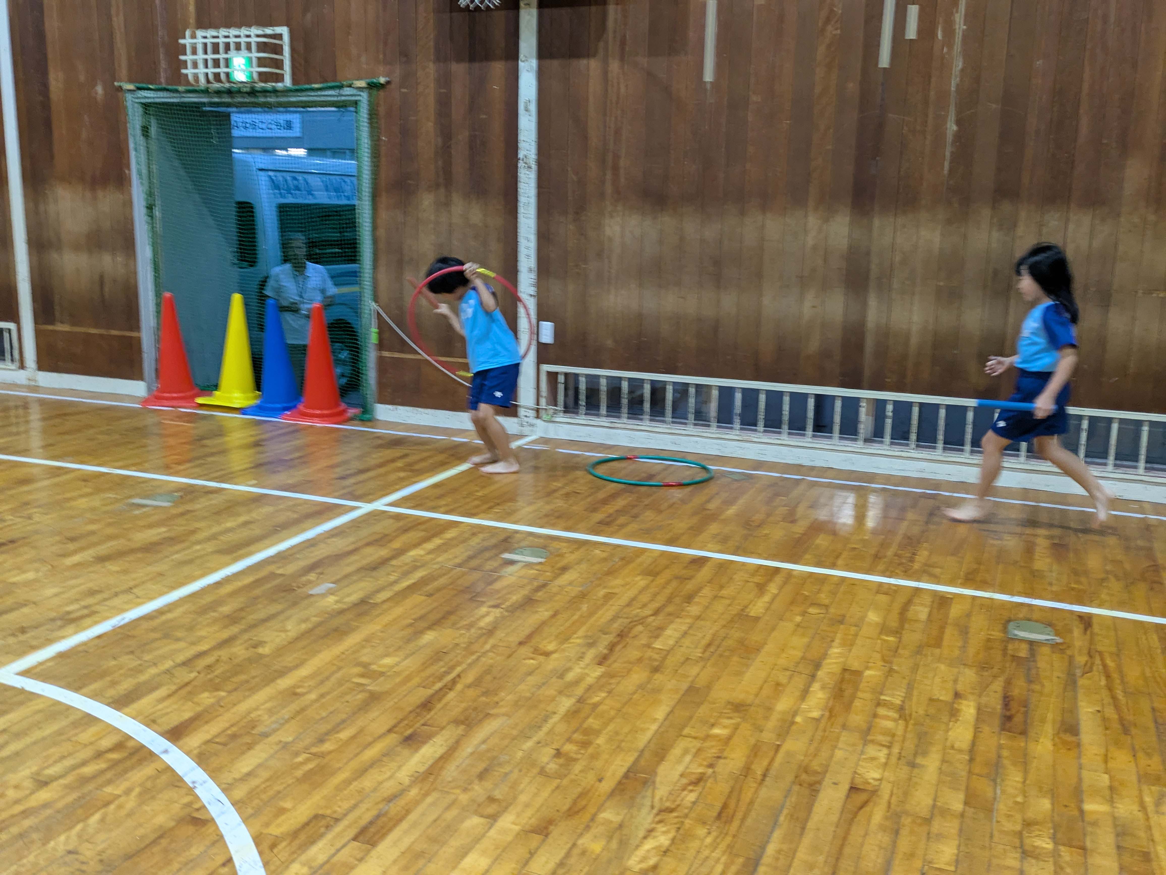 走るだけでなく、アヒルを使ってお手玉を運んだり、フープをくぐったりゴムジャンプをしたりなどの障害物競走もしました!