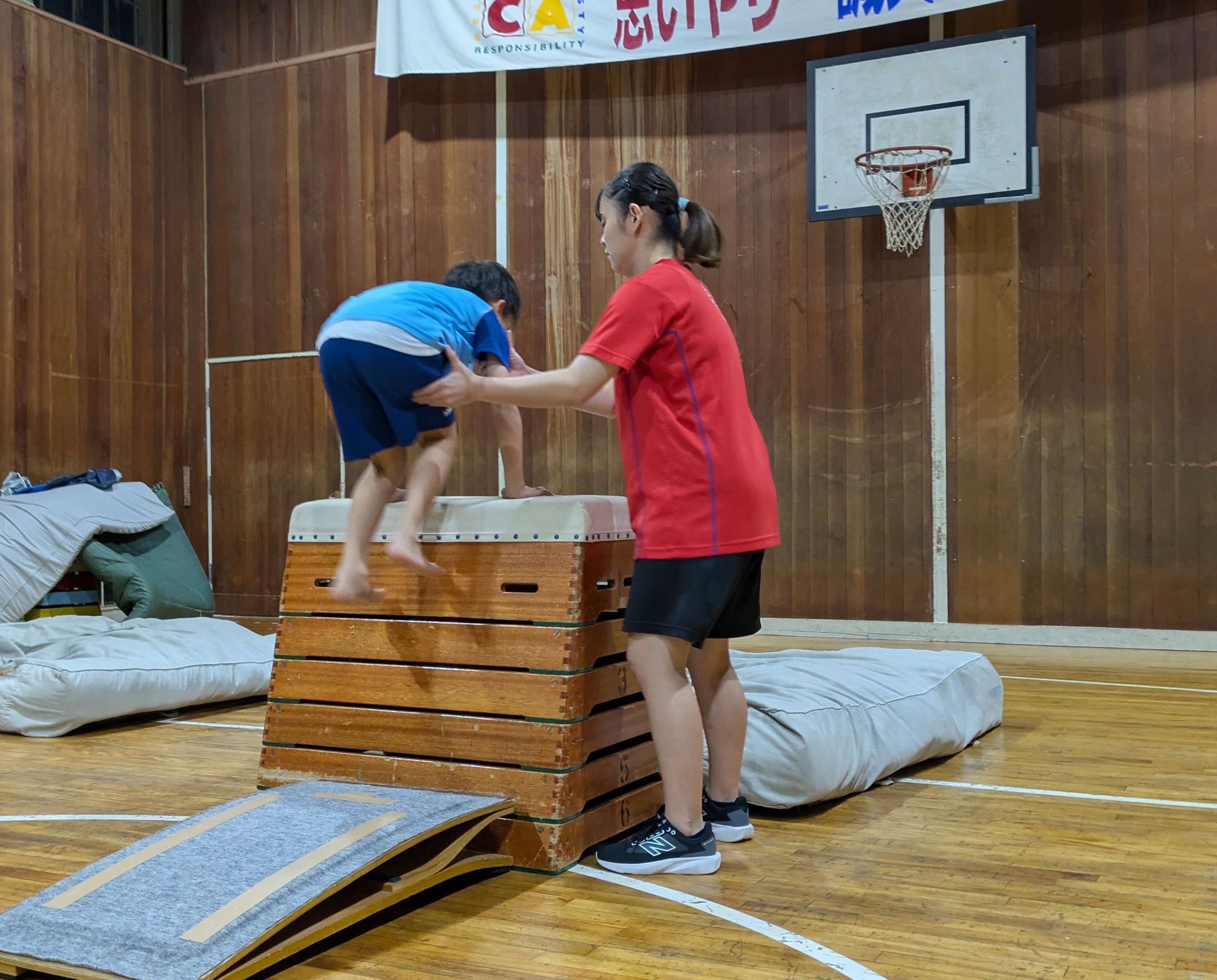 跳び箱では、ジャンプをしっかりして、おしりを高く上げて跳べるように頑張りましょう!