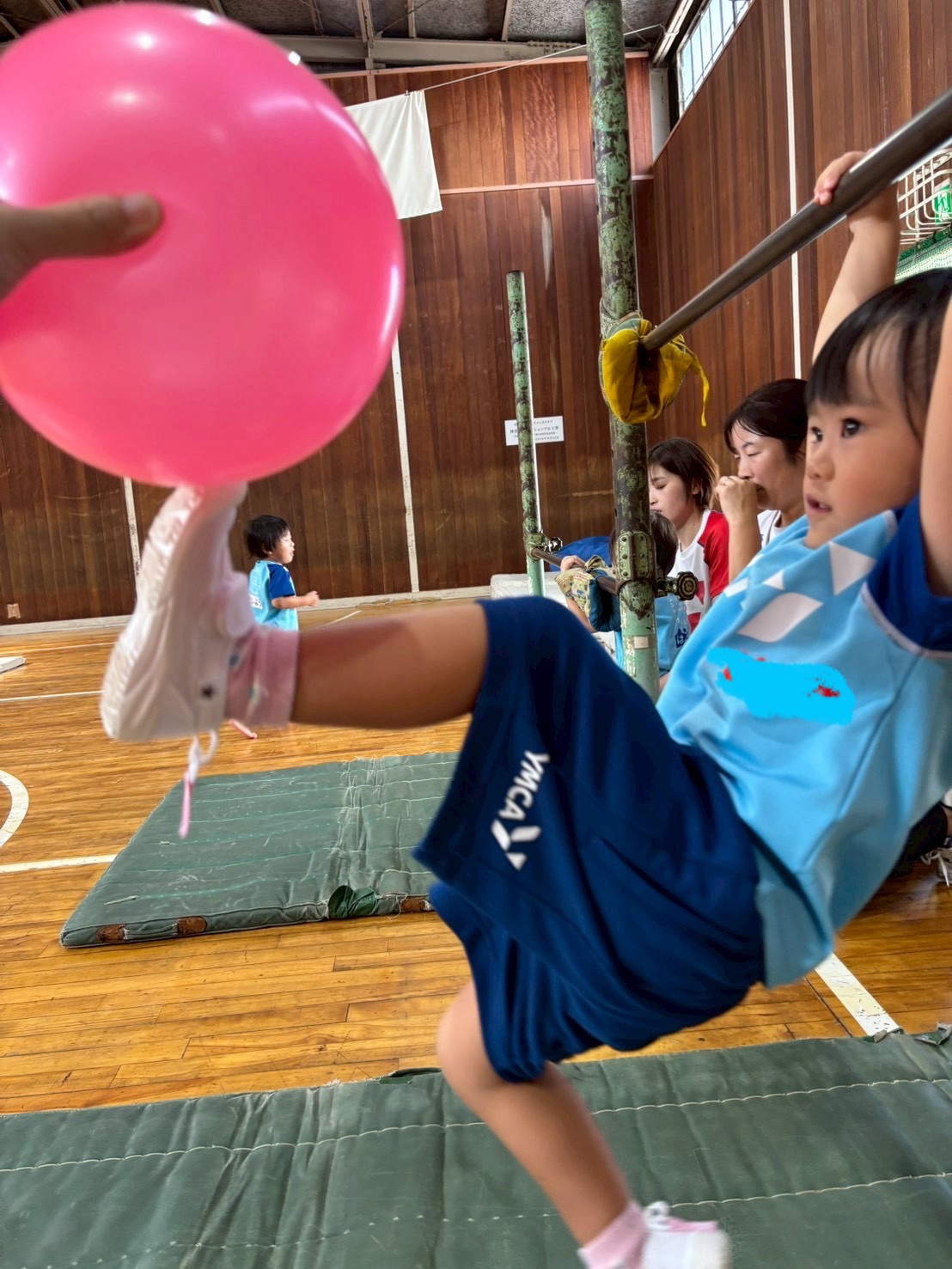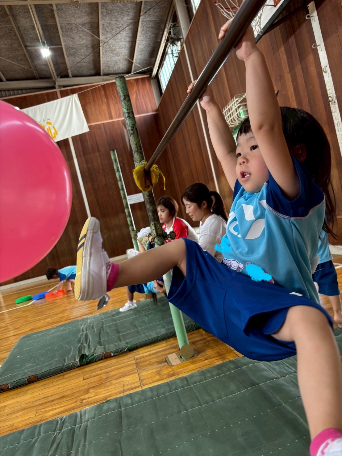 鉄棒では今日も`ぶら下がってからのキック!`を頑張りました。慣れてくると両足も持ち上がりました。