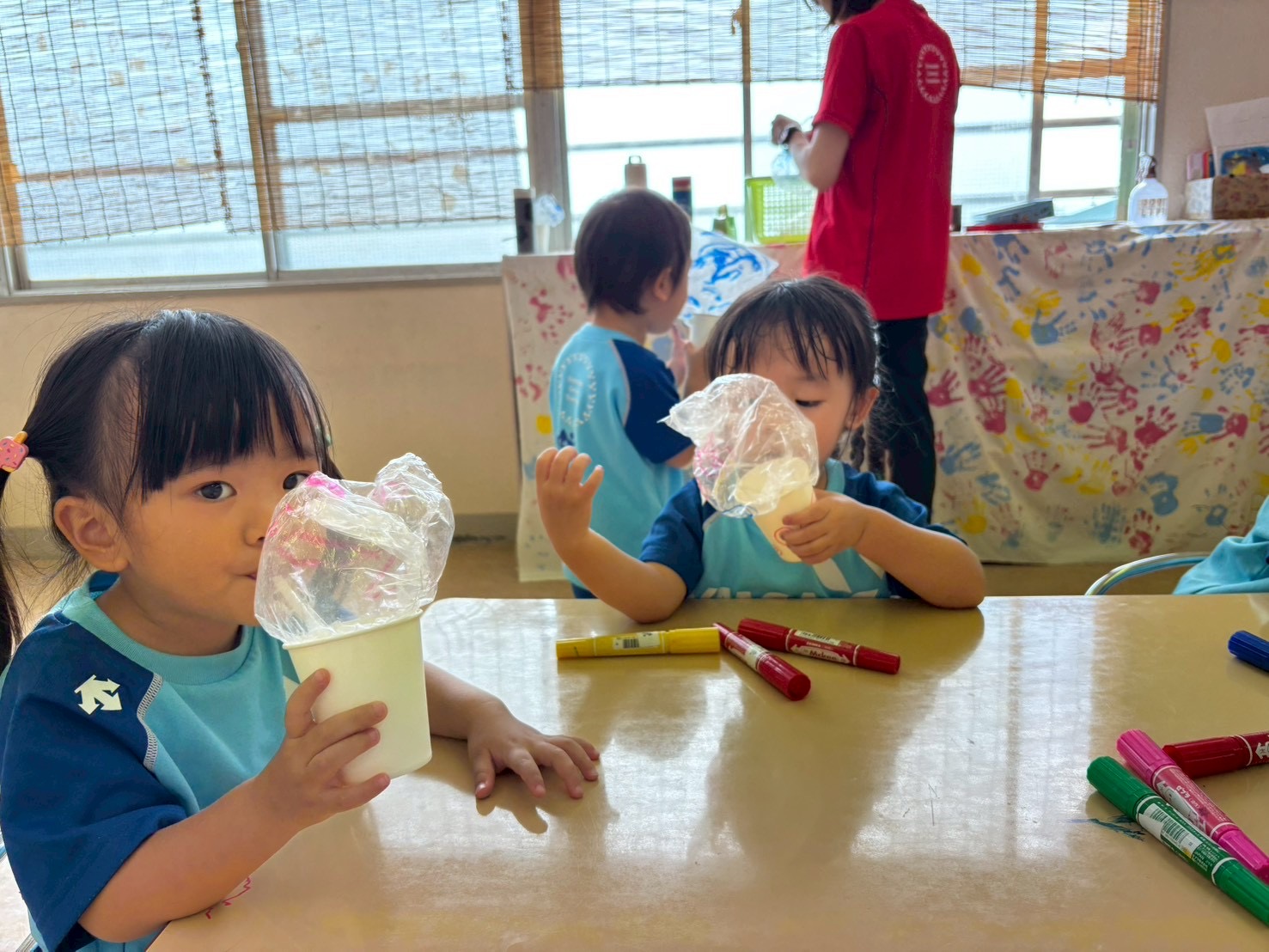 お部屋では紙コップお化けを作りました。工程は簡単でしたが、みんなお気に入りな様子で何度もふくらませては小さくしてを繰り返していました(#^.^#)