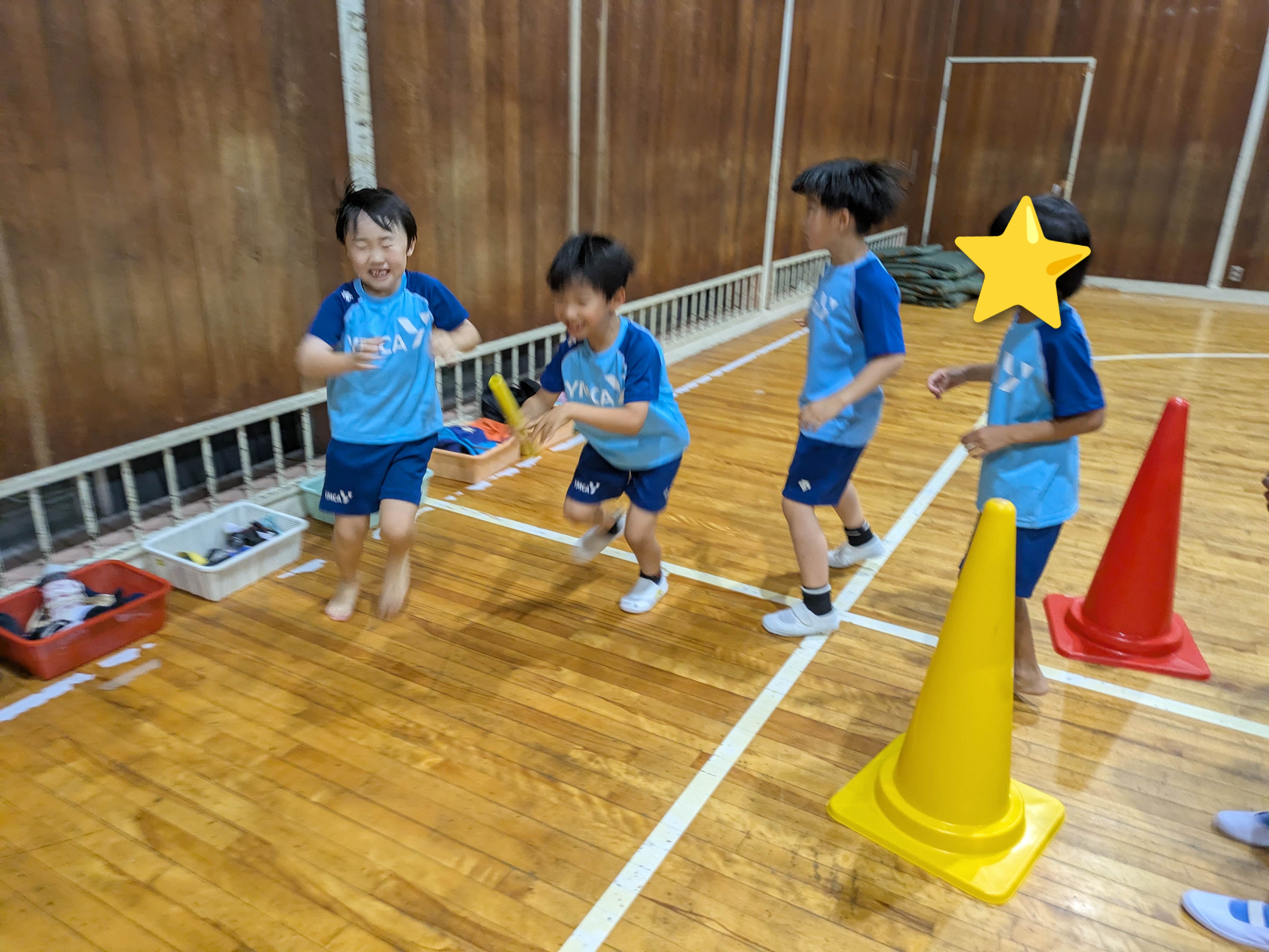 リレーでは、ただ走るだけでなくアヒルにお手玉を乗せて運んだり、フープをくぐったりふわふわマットの上を走ったり障害物競争もしました!待っているお友だちは、大きな声で応援をしており、とても白熱した戦いとなりましたね!