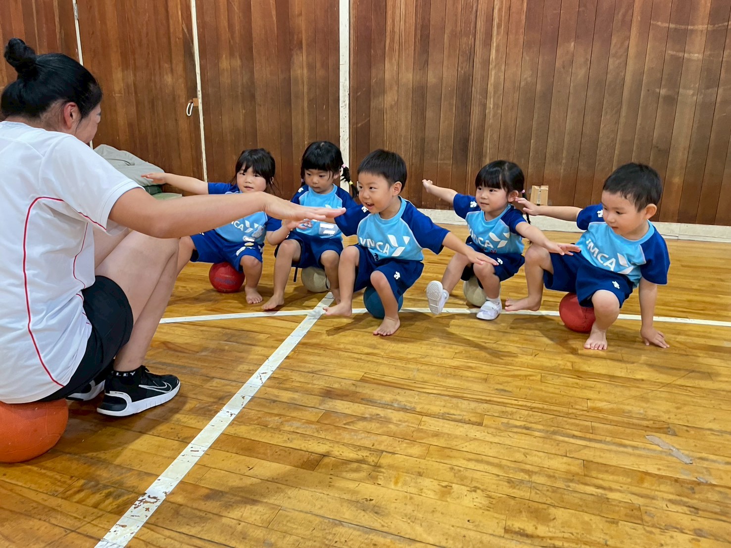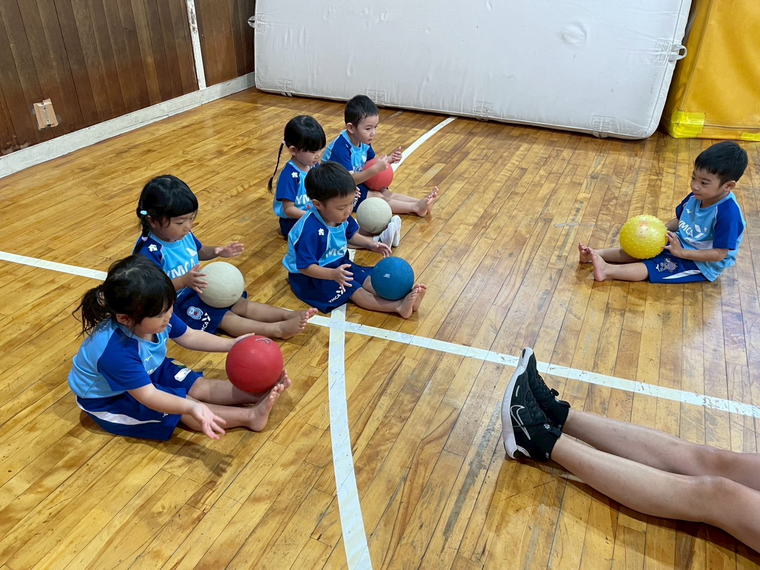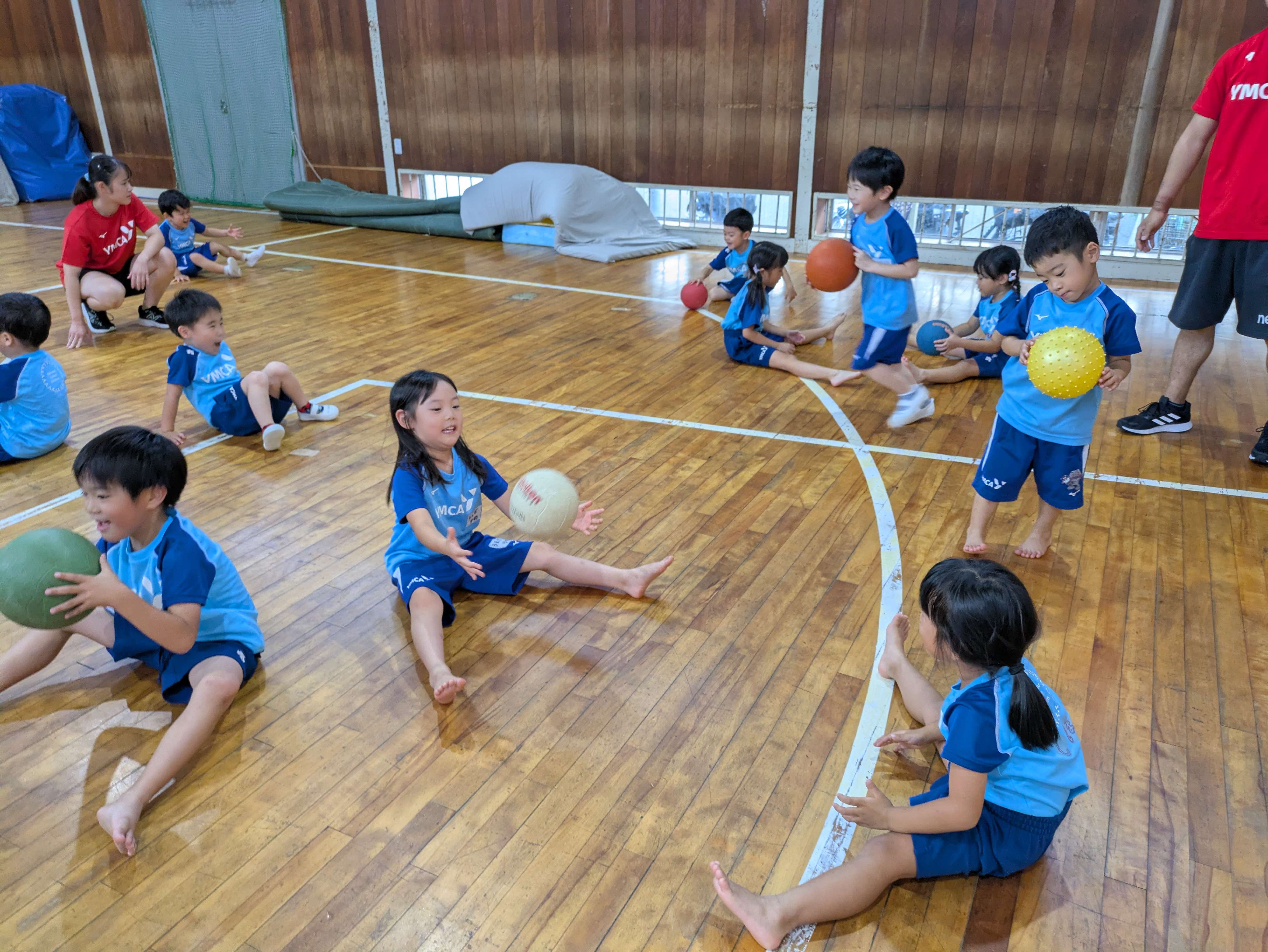 年少さんは、1人1球使ってボールの上に座ってバランスをとったり、ドリブルをしたりしました!