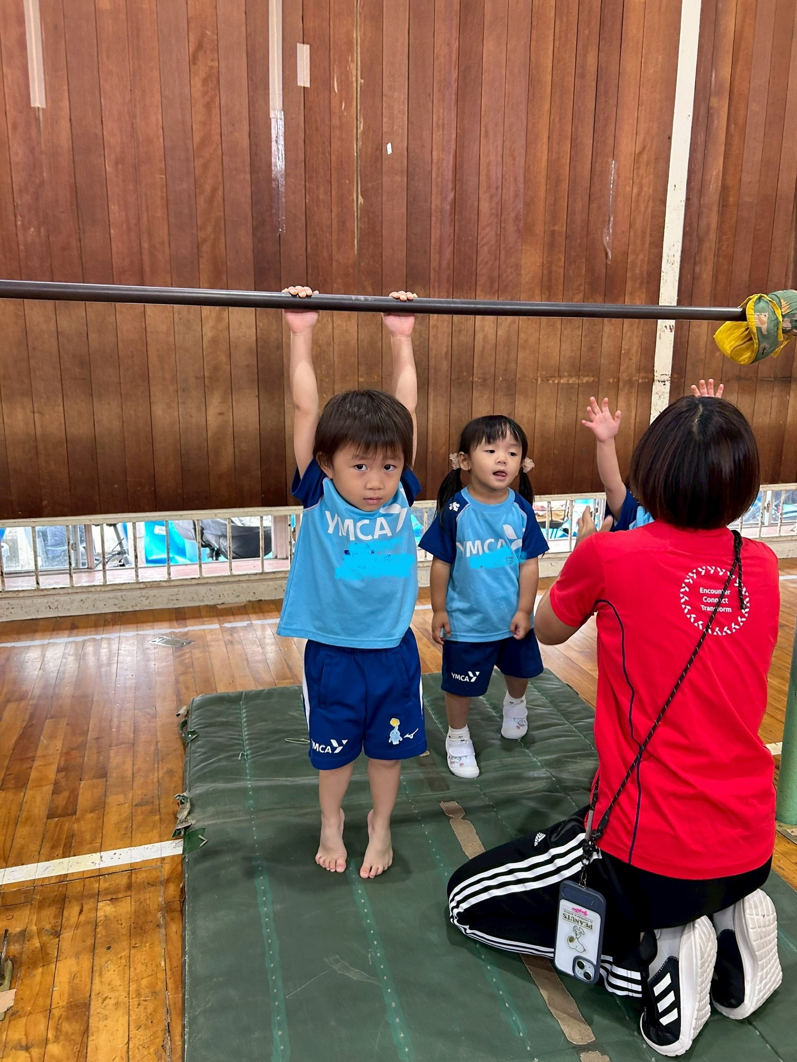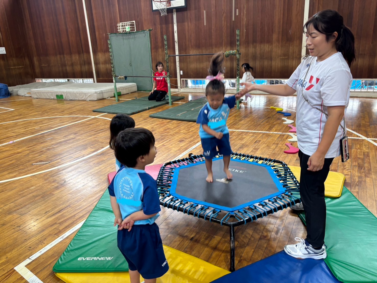 ミニトランポリンにもチャレンジ!体幹がしっかりしてきたのでまっすぐ高く飛べるようになってきましたね(^^)/次回からは大きなトランポリンを跳んでいきま~す!