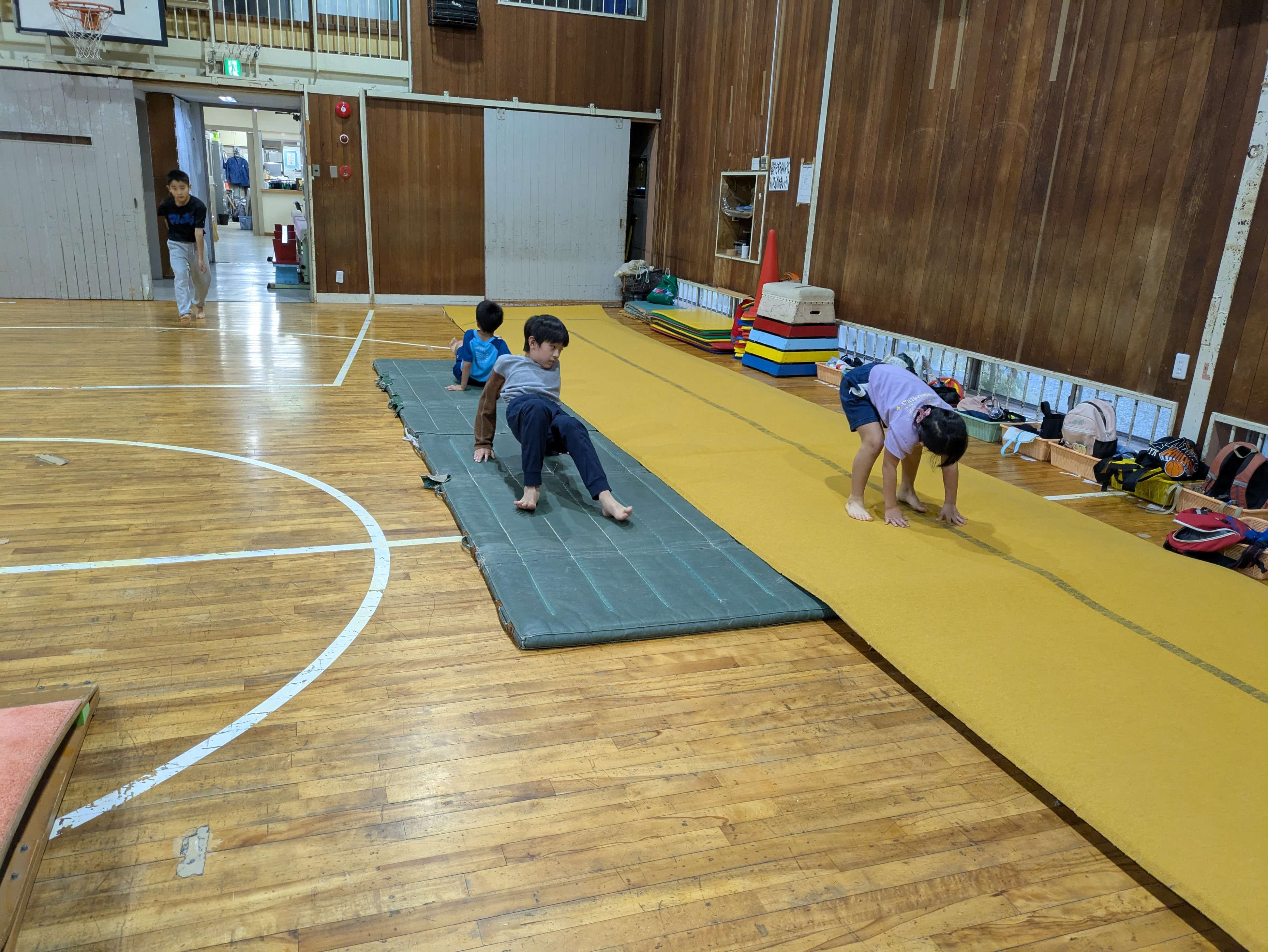2分間トレーニングでは、倒立やなわとび、ゆりかご腹筋と背筋などをしました。
