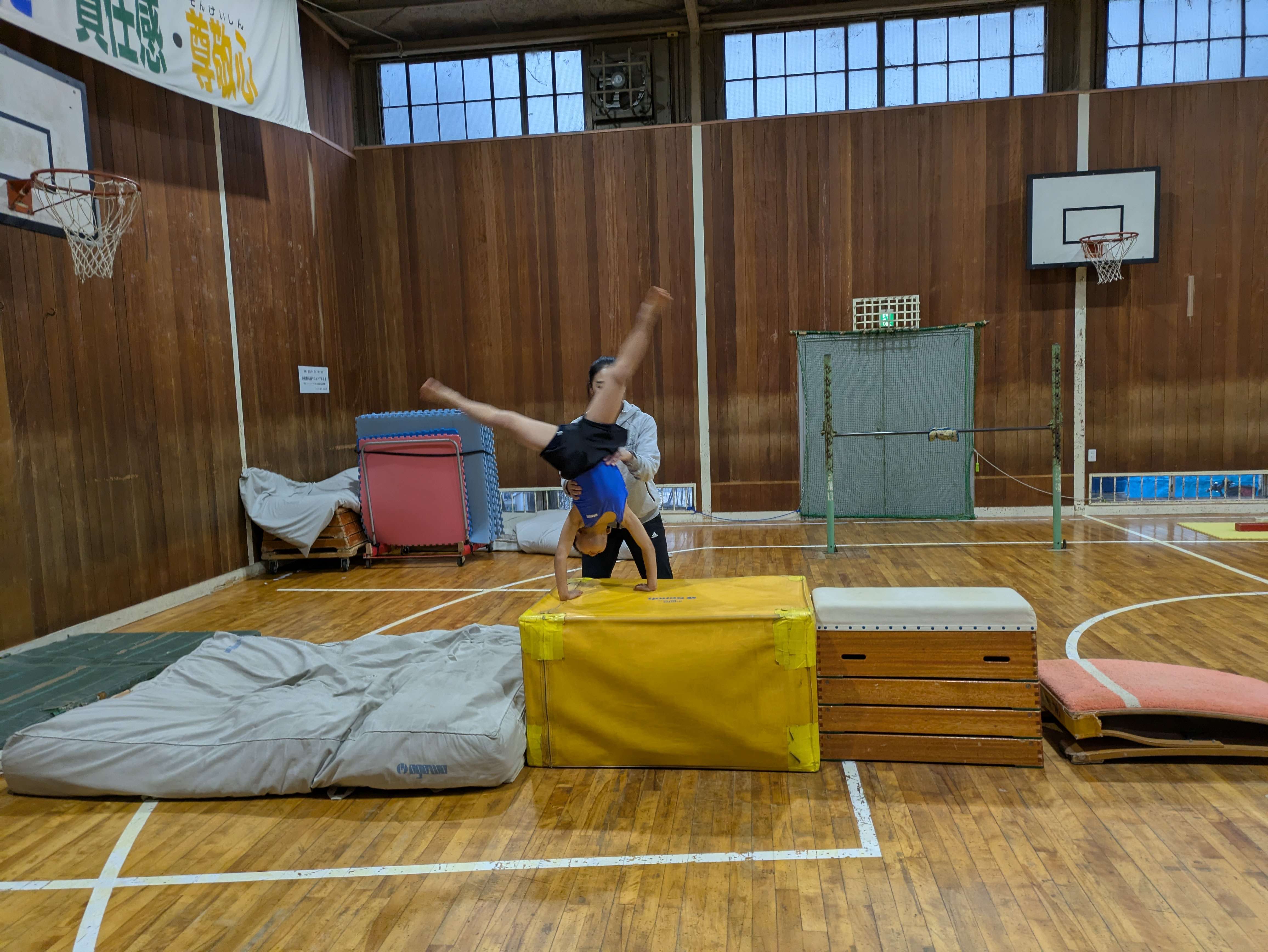 台からのロンダートや転回では、足をまっすぐ上げて倒立を経過して技ができるように頑張りましょう!