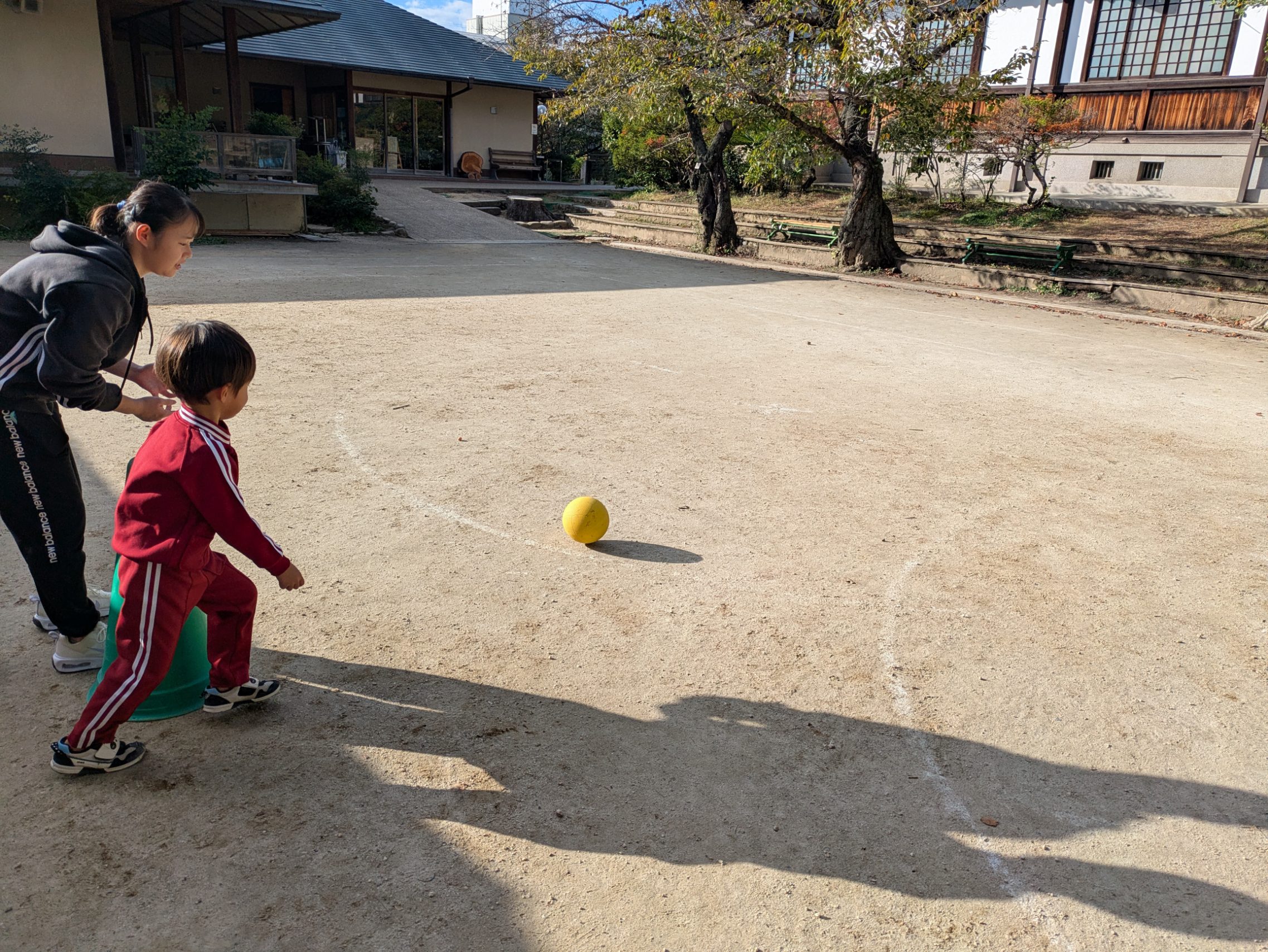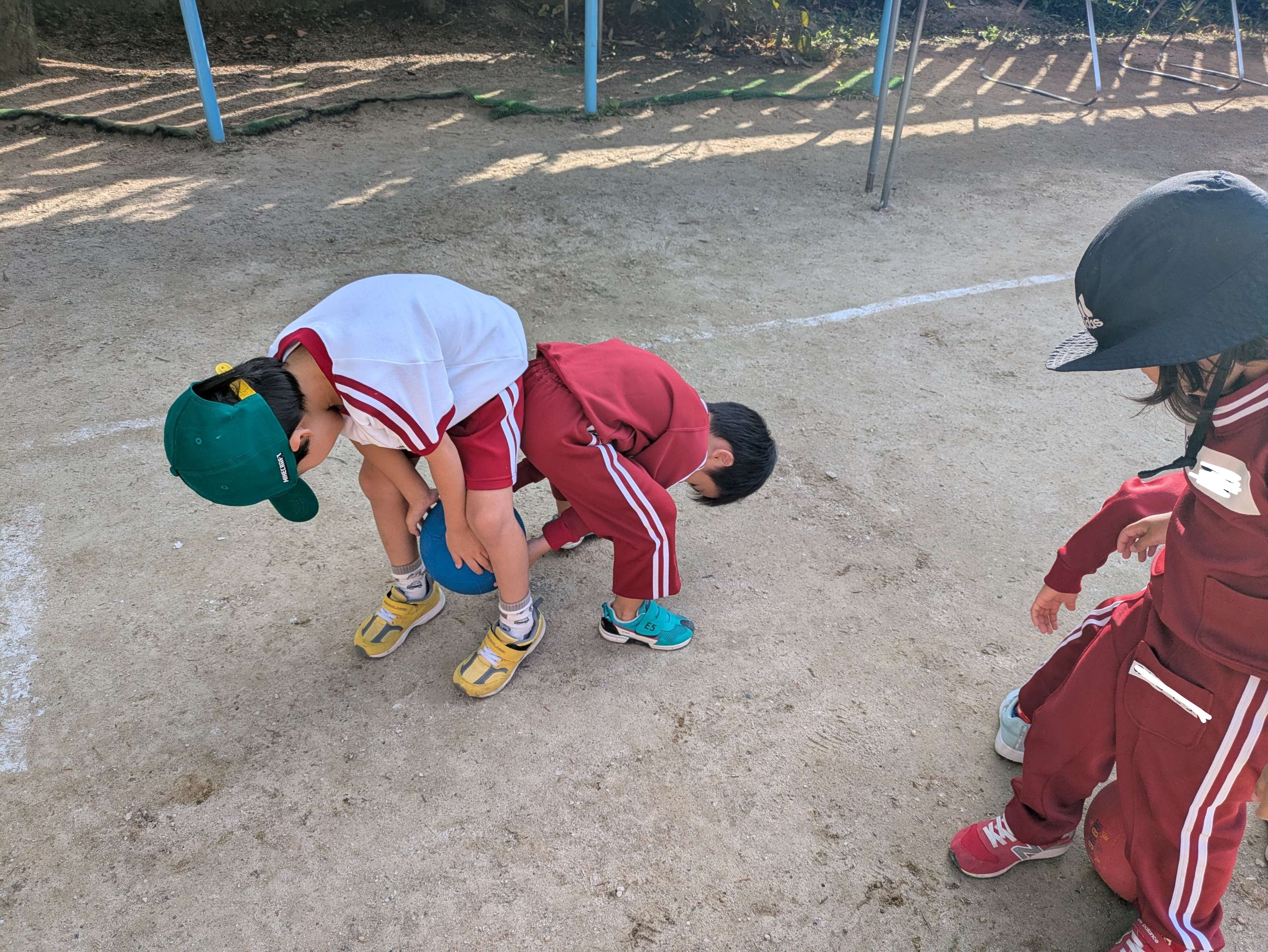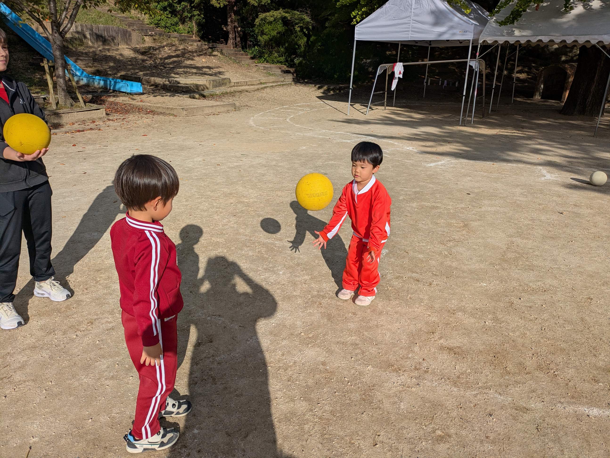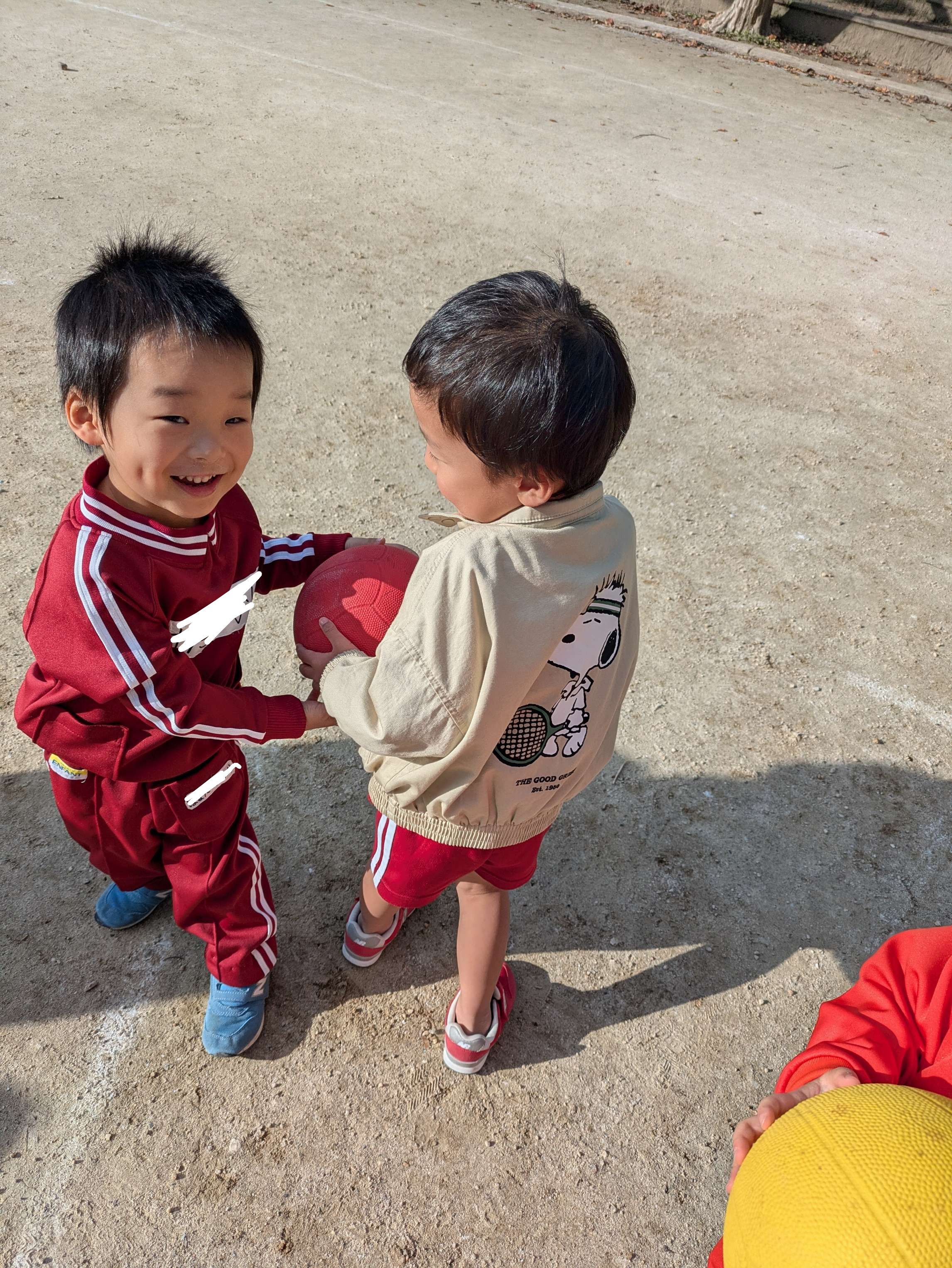 2人組になって足の下や頭の上から渡したり、バウンドでキャッチボールをしたりしました。お友だちのことを考えて渡すことができていましたね!